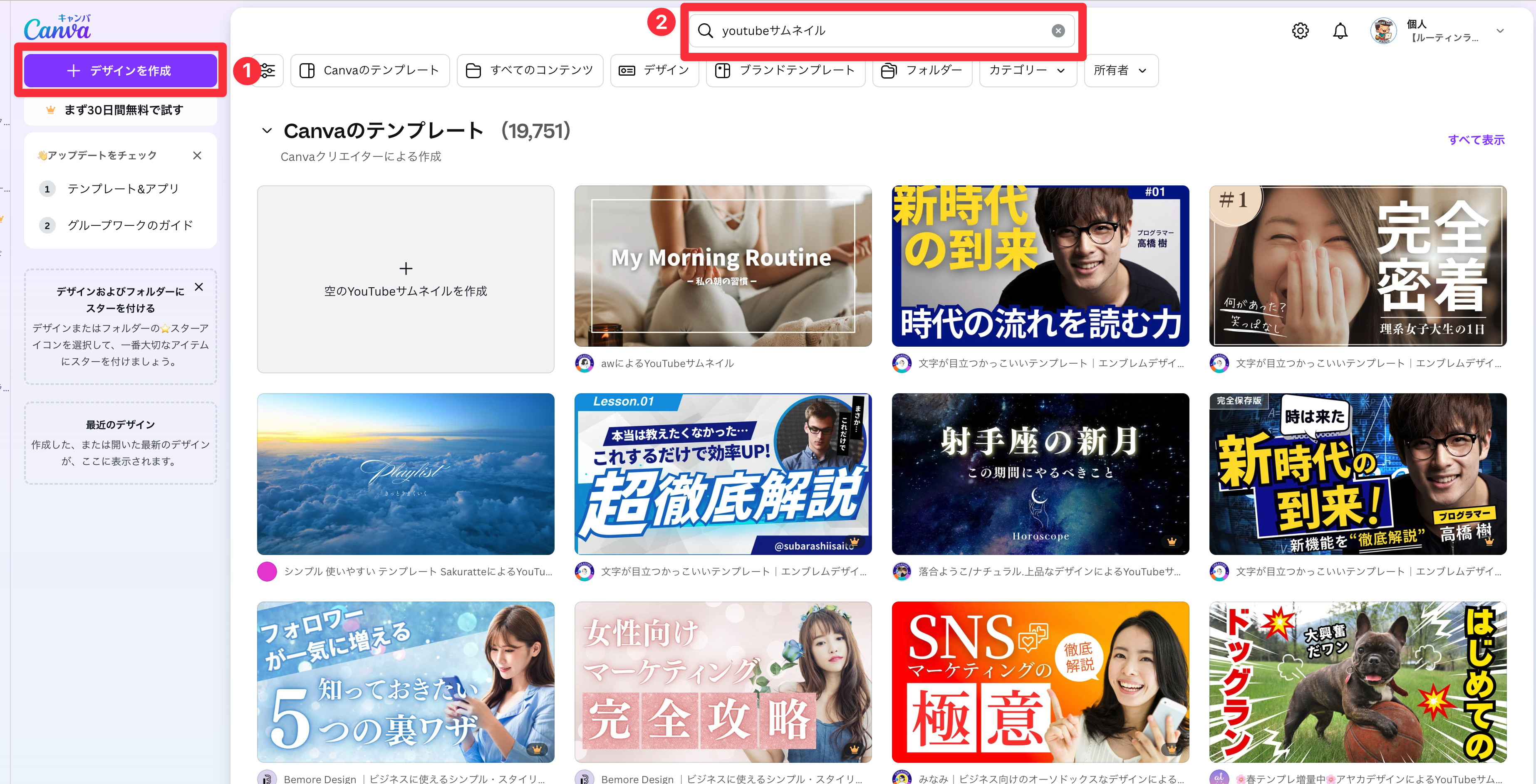 まずは、Canvaにアクセスし、新規デザインを作成します。デザインサイズを選択「デザインを作成」ボタンをクリックし、「YouTubeサムネイル(1280×720px)」や「カスタムサイズ」を指定し、対象となる画像サイズを選択します。