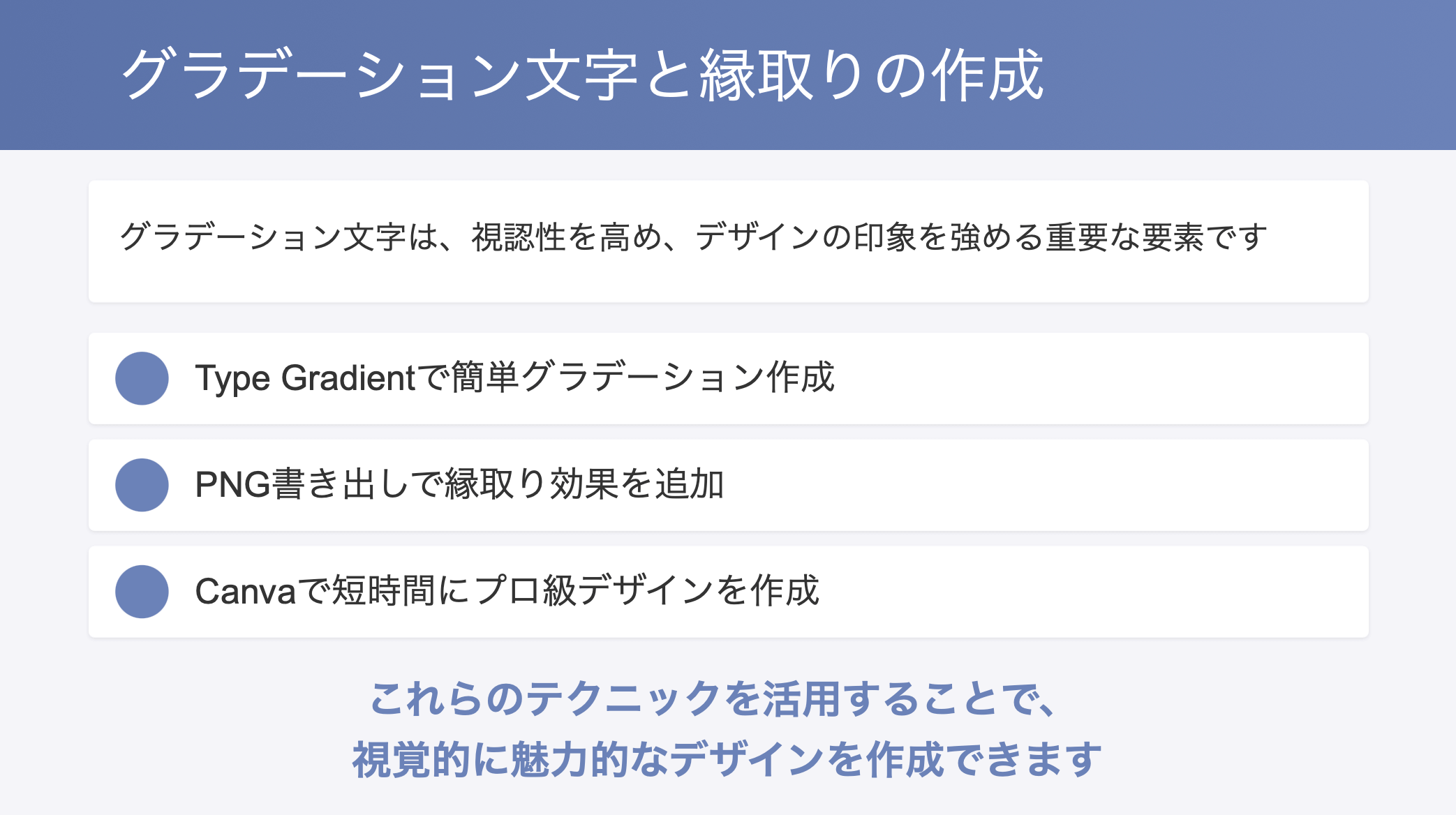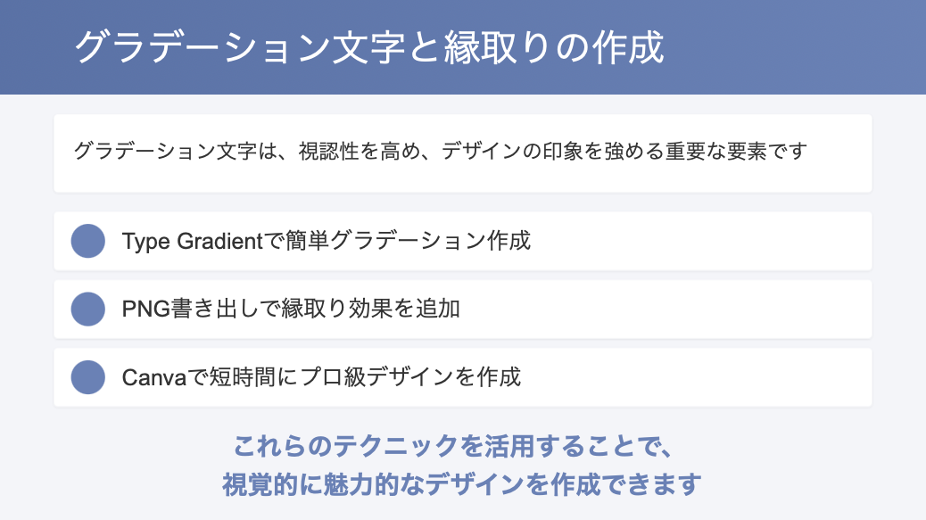 グラデーション文字は、視認性を高め、デザインの印象を強める重要な要素です。また、縁取りを加えることでさらに強調され、より洗練されたデザインに仕上げることができます。今回のポイントを整理すると、以下の通りです。