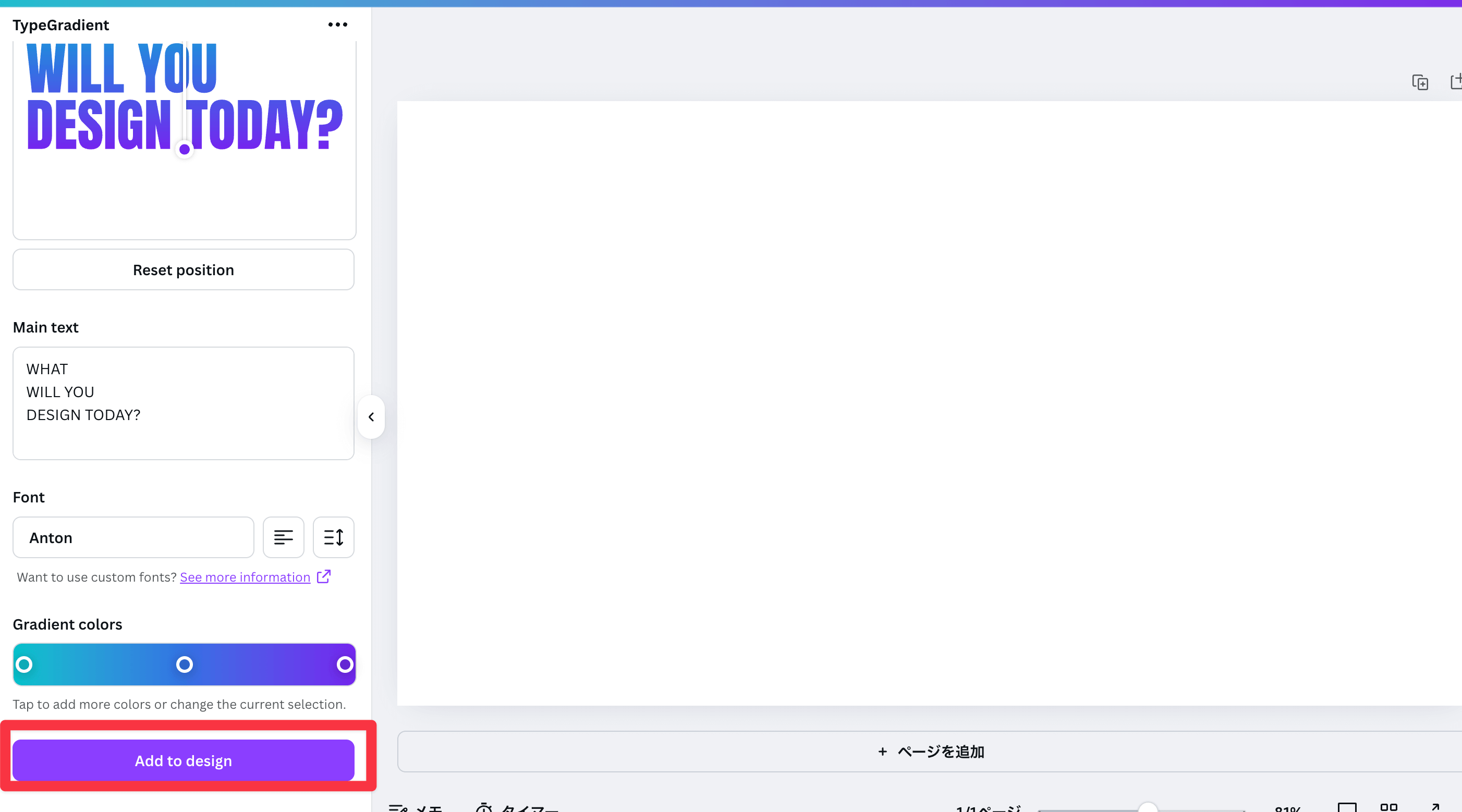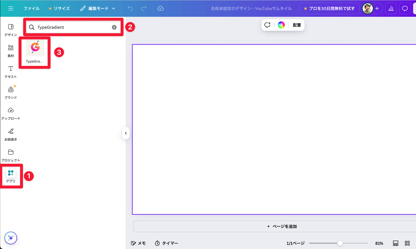 デザインページが立ち上がったら「アプリ」を「Type Gradient」と検索し、Type Gradientアプリを立ち上げます。