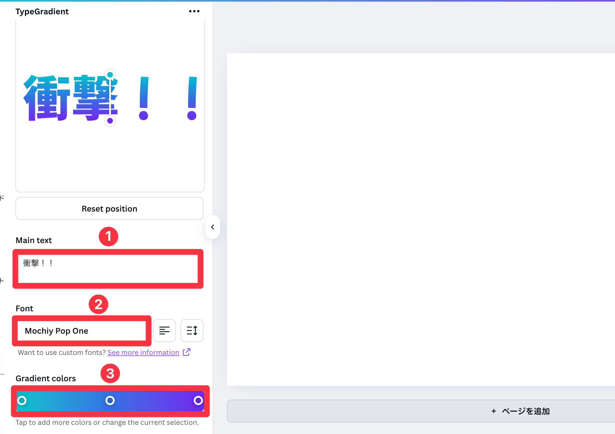 Type Gradientの編集画面に移動したら、順番に「テキストの内容」「フォントの種類」「グラデーションの配色」をそれぞれ編集していきます。