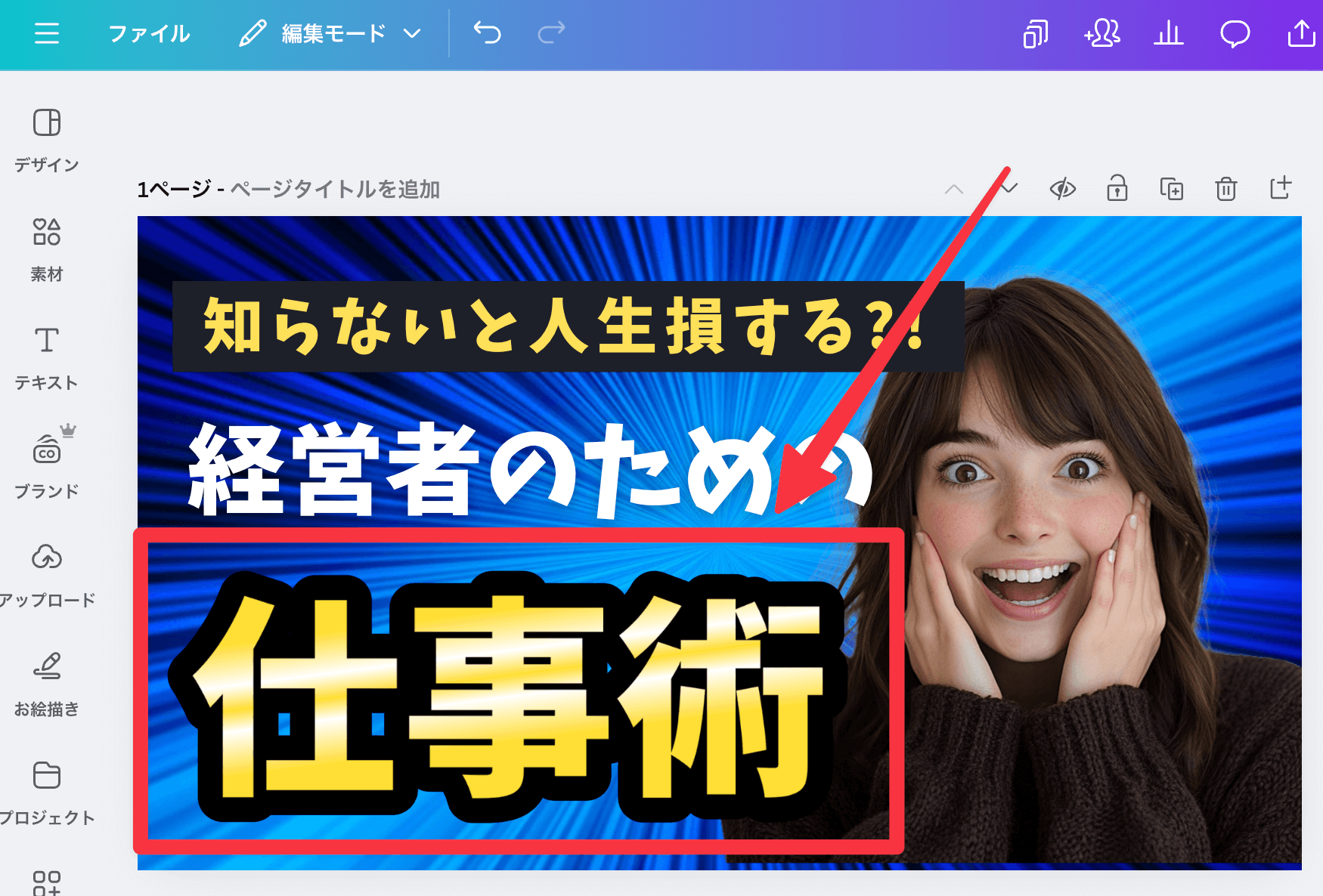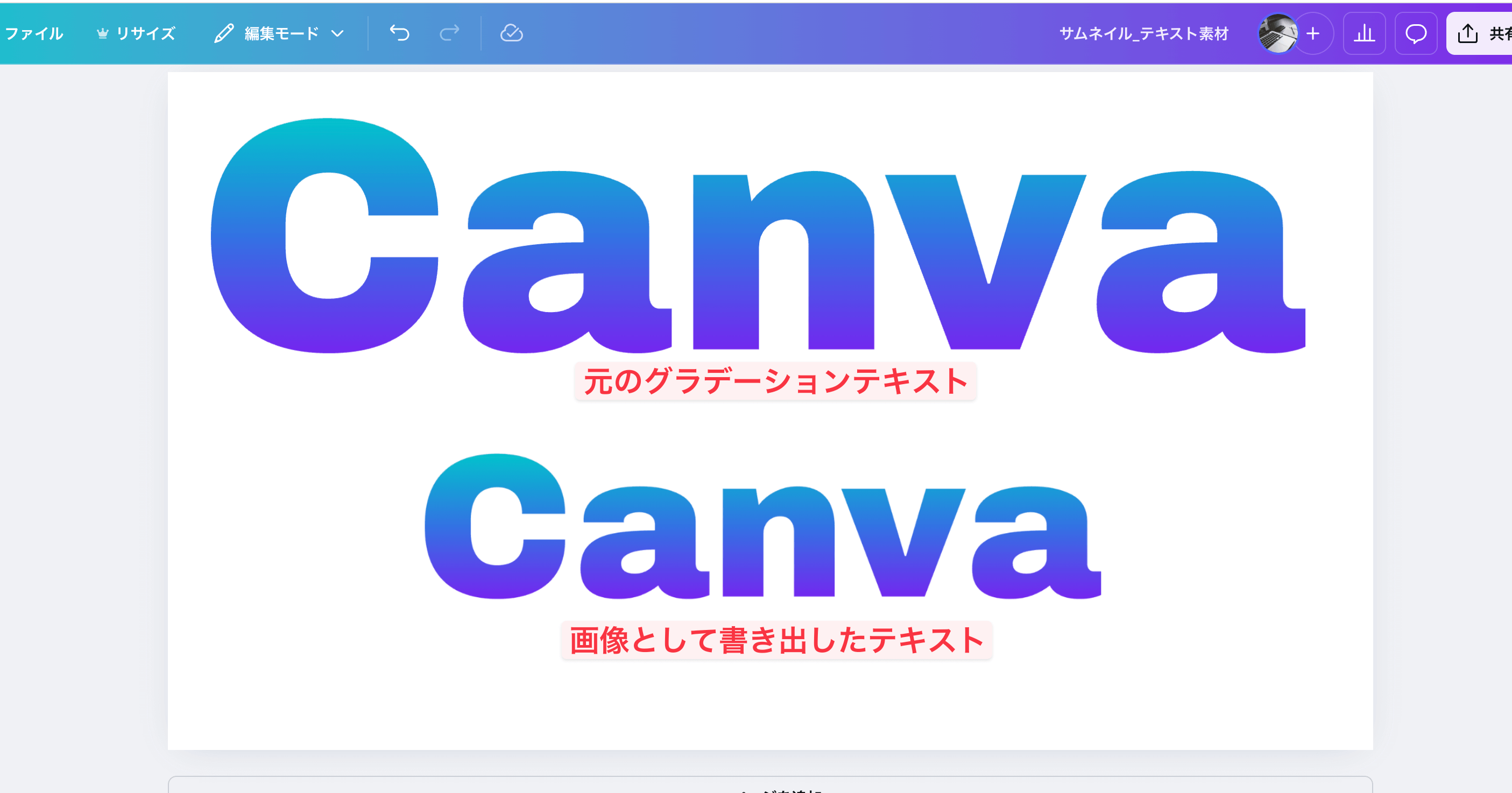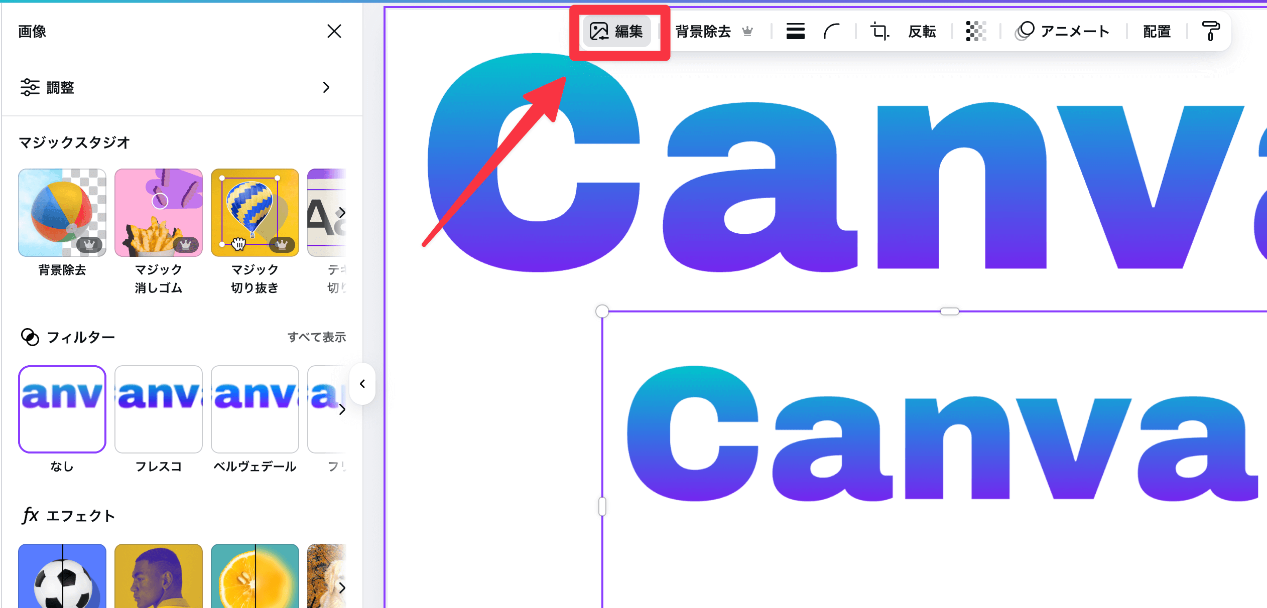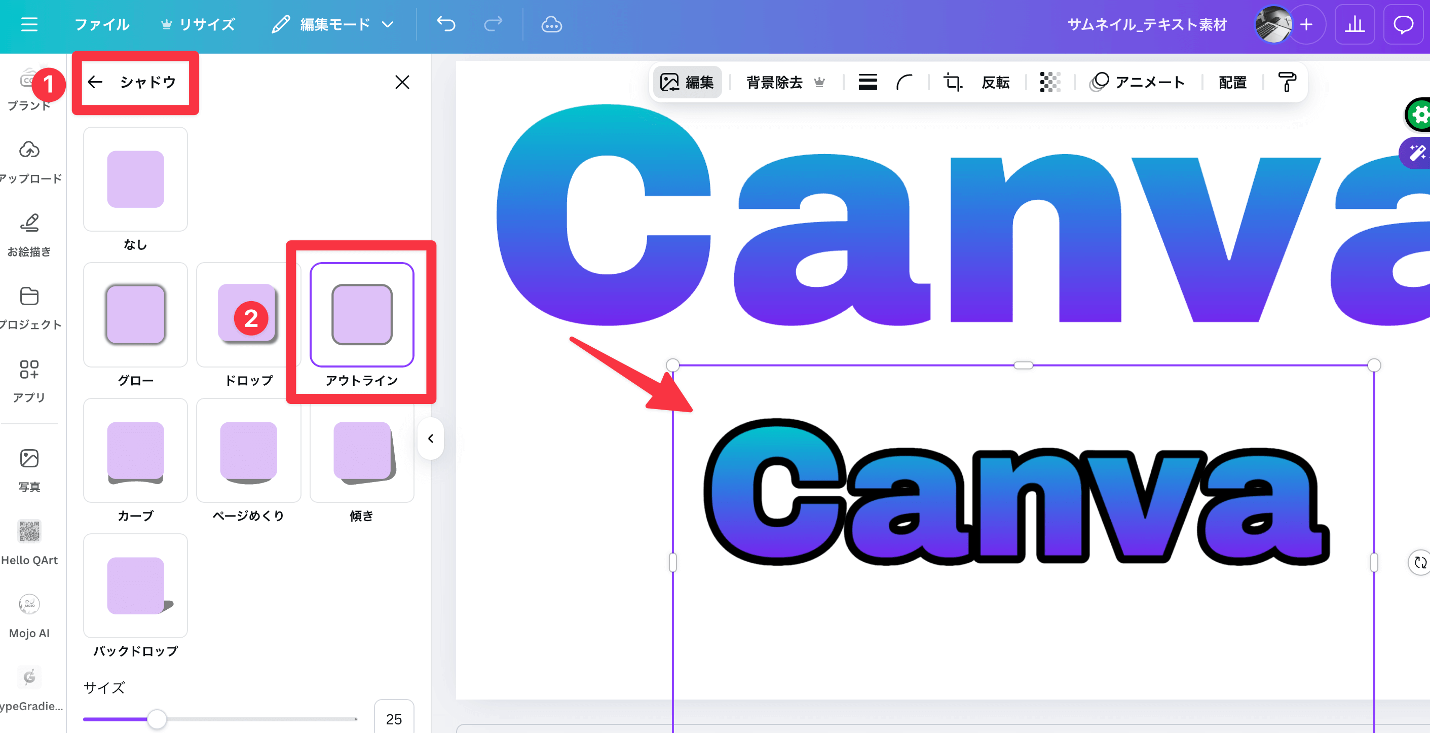 縁取り(アウトライン)の追加をしていきます。アップロードしたグラデーションテキストをクリックし、画面上部に表示されるメニューバーから「編集」をクリックしていきます。