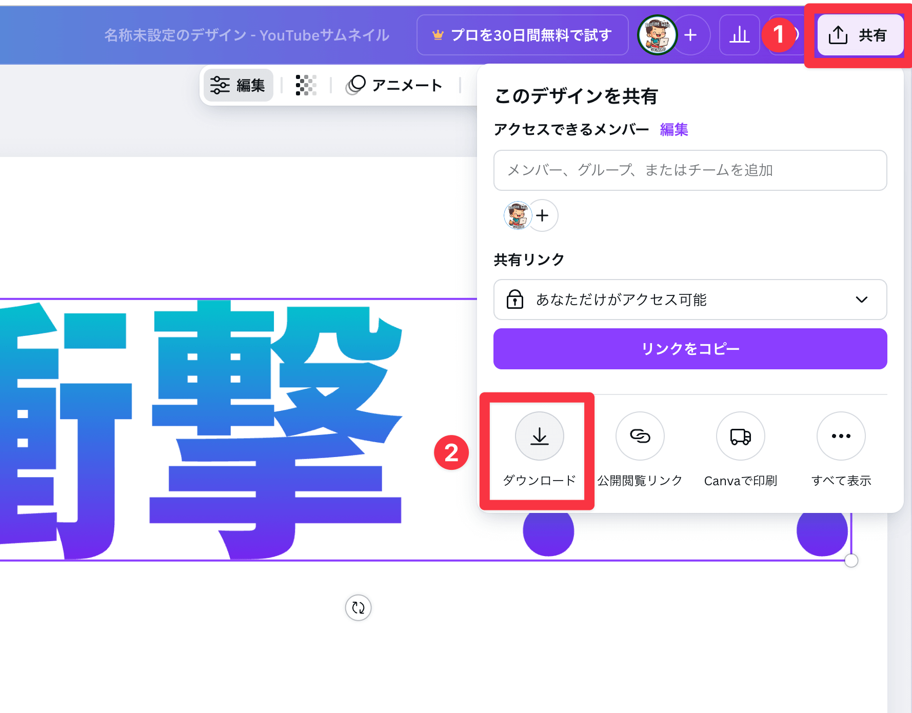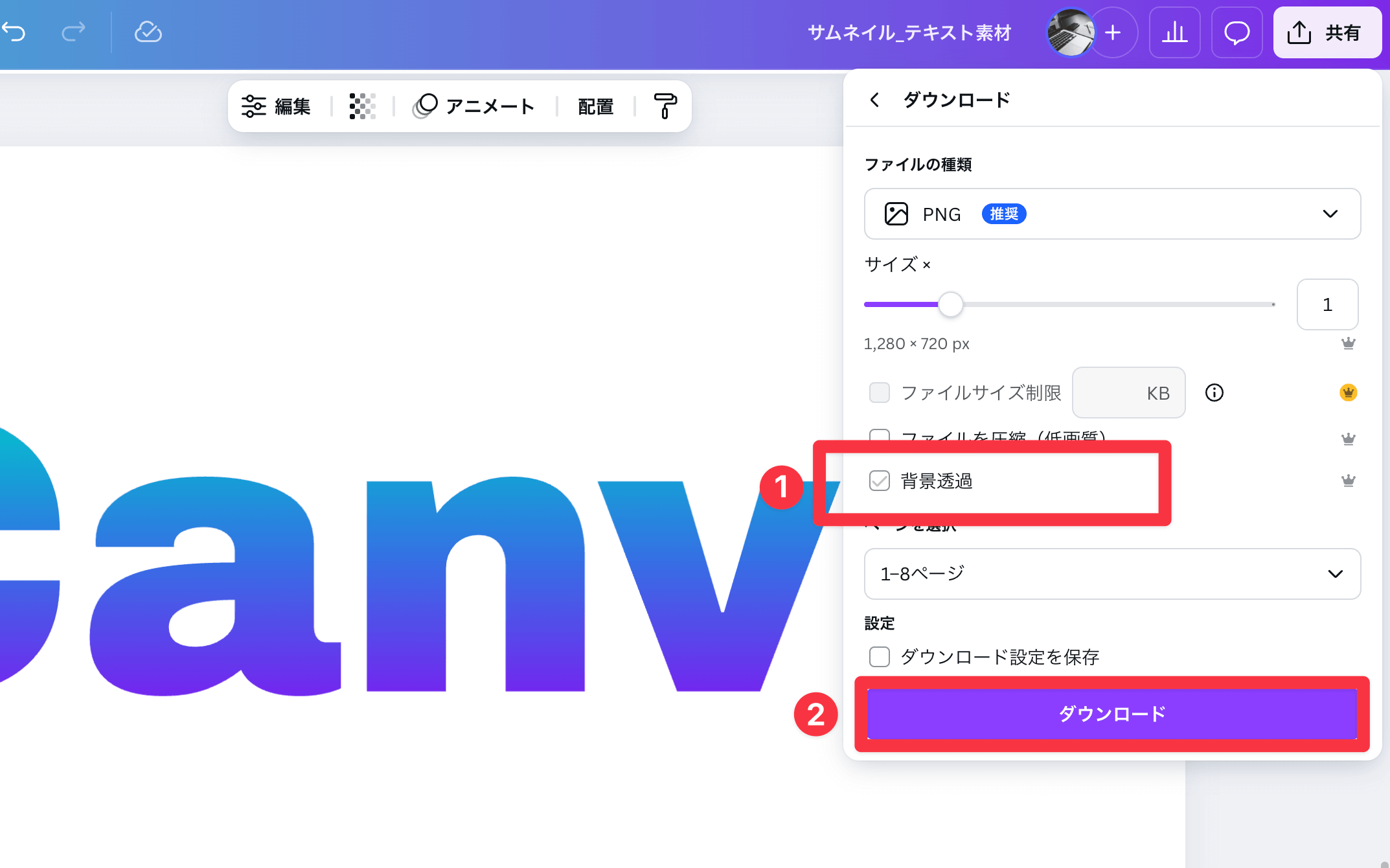 まずは先ほど作成したグラデーション文字を画像として書き出す作業を行います。「共有」→「ダウンロード」の順番にクリックしていき、「背景透過」→「ダウンロード」にて、画像として書き出します。