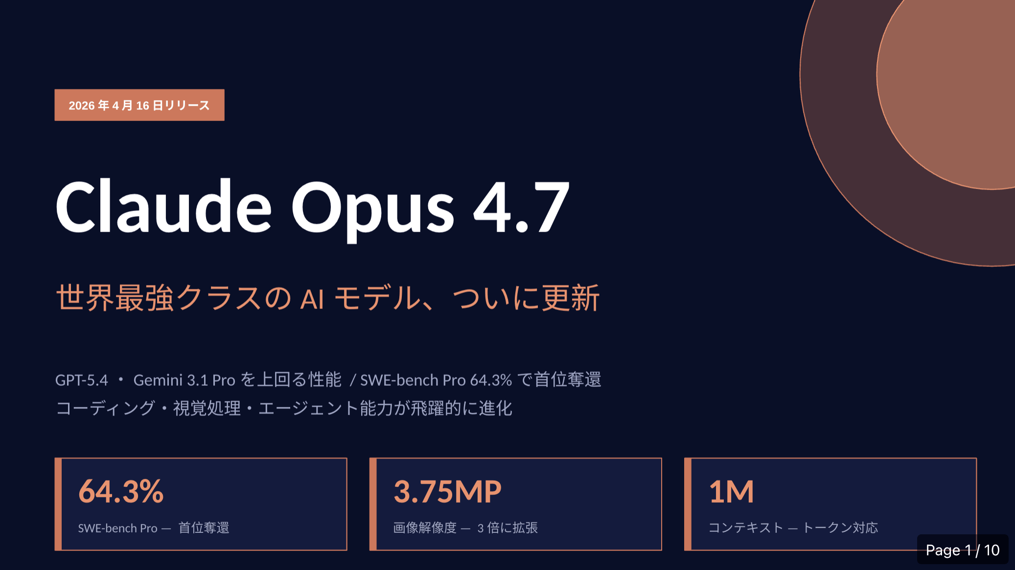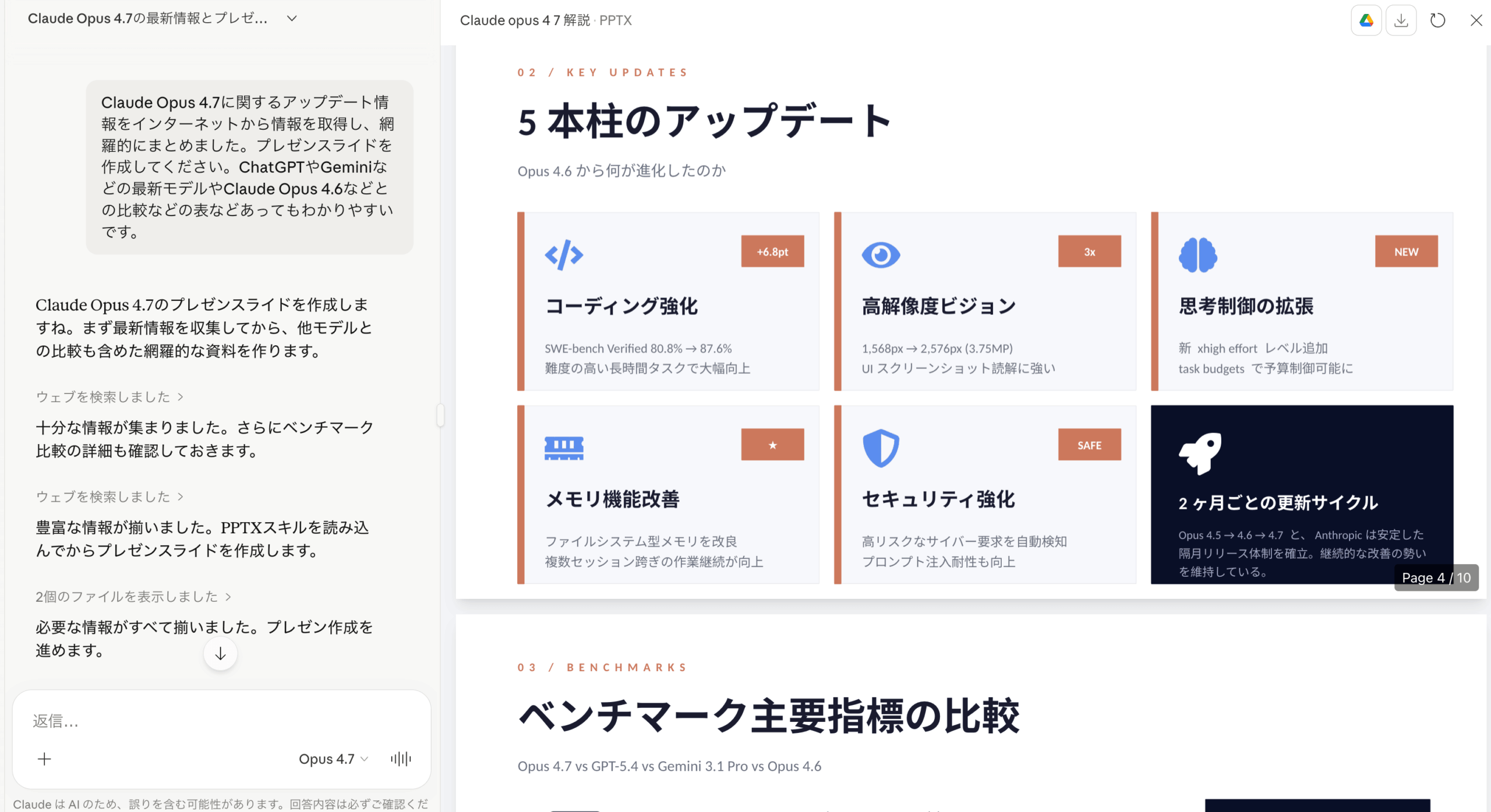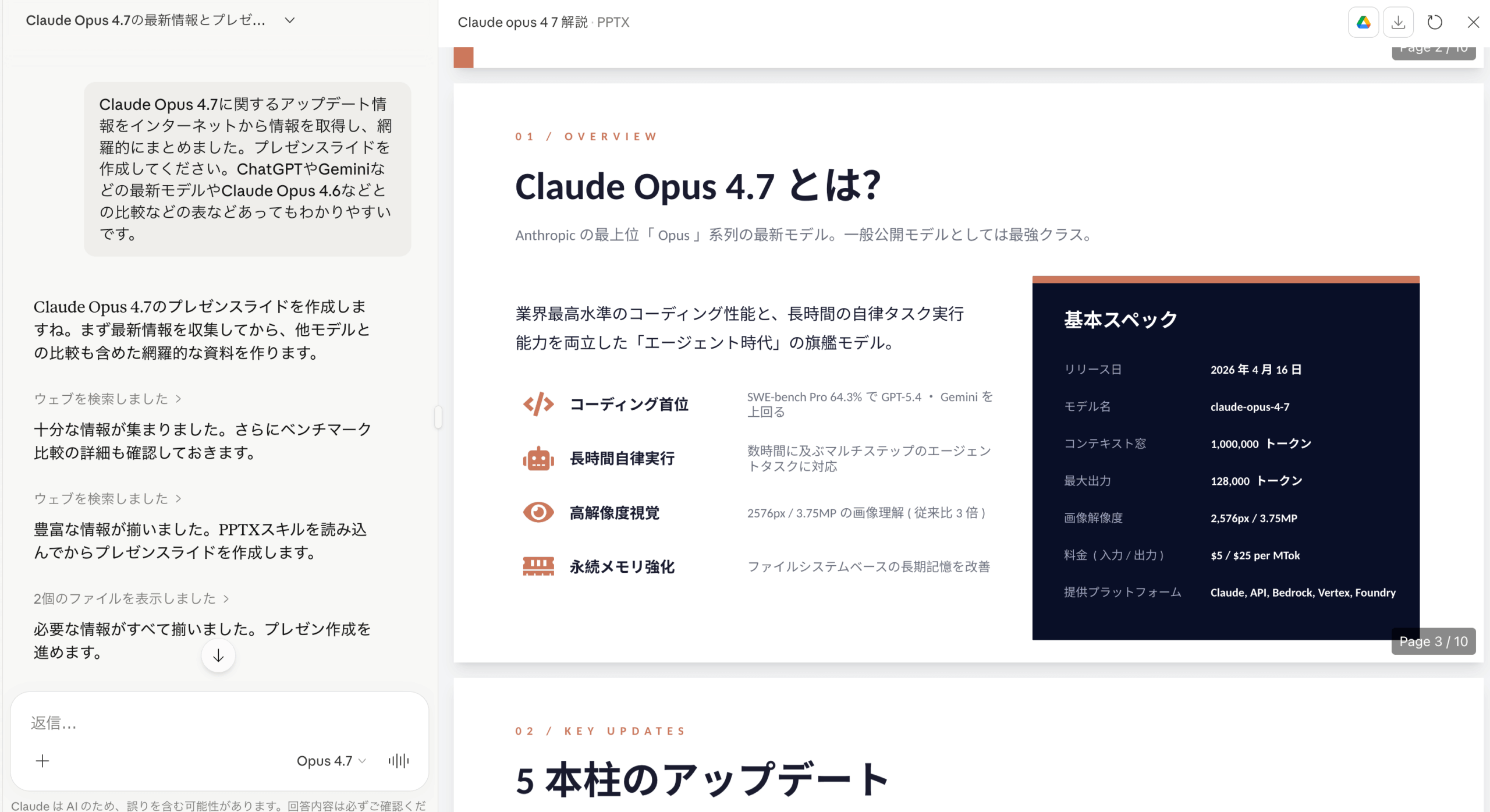 続いてビジュアル面のアップデートを検証するため、Anthropic公式のClaude Opus 4.7アップデート情報を読み込ませてプレゼンスライドを生成させてみました。