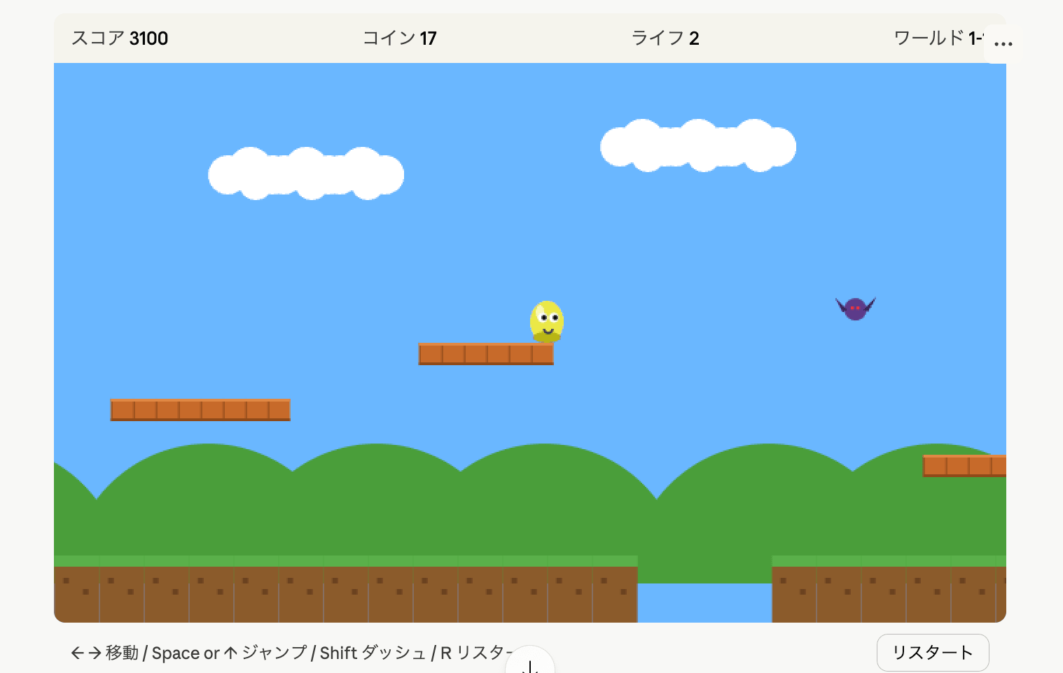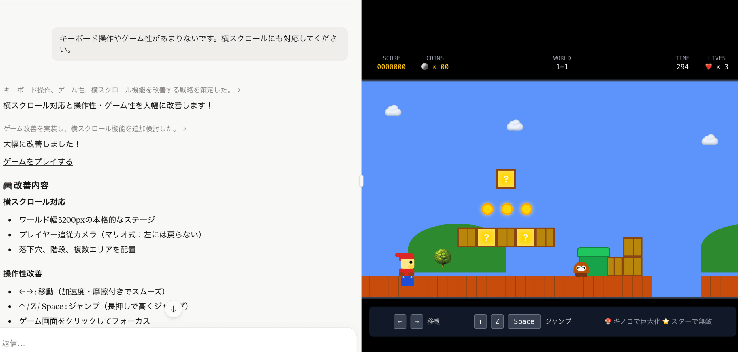 新モデルが出るたびに試している「2Dスーパーマリオ風アクションゲーム」をClaude Opus 4.7でも生成しました。