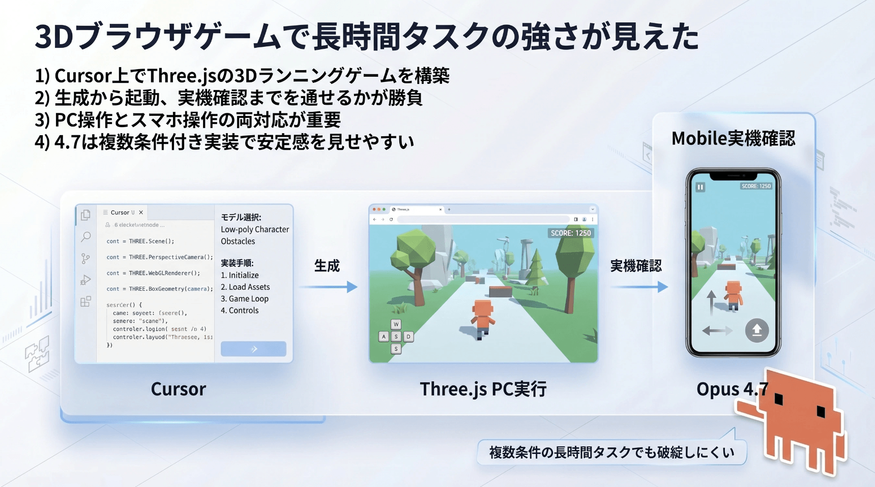 さらに3Dブラウザゲームも検証しました。Three.jsを使った3Dランニングゲームを生成したところ、キャラクター造形は簡素ながらランニング・コース切り替え・障害物が安定したフレームレートで動作しました。