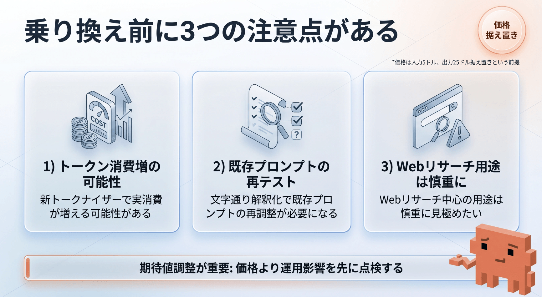 最後に、Claude Opus 4.7を使う前に押さえておきたい注意点を整理します。
