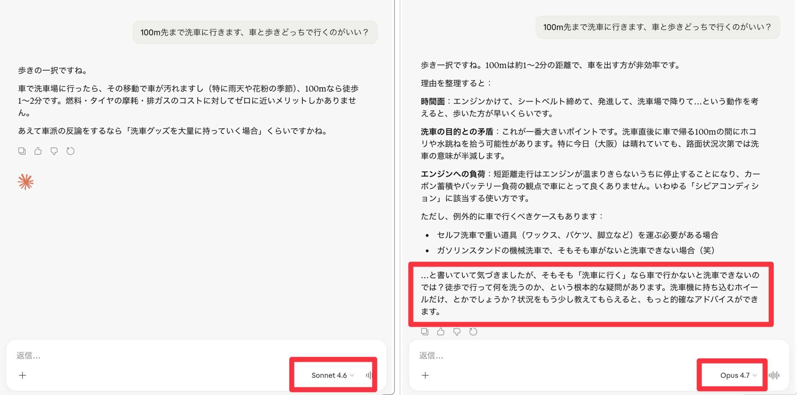 まずは文脈の読み取り精度を検証しました。Xで話題になった「100m先の洗車に行きます。車と歩きどっちで行くのがいいですか?」というひっかけ問題を、SonnetとOpusで同時に投げてみます。