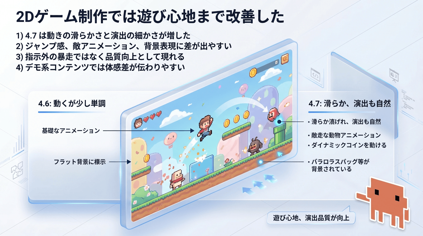 - 文脈解読やプレゼンスライド生成の精度が向上し、2D/3Dゲーム制作までワンショットで可能になった