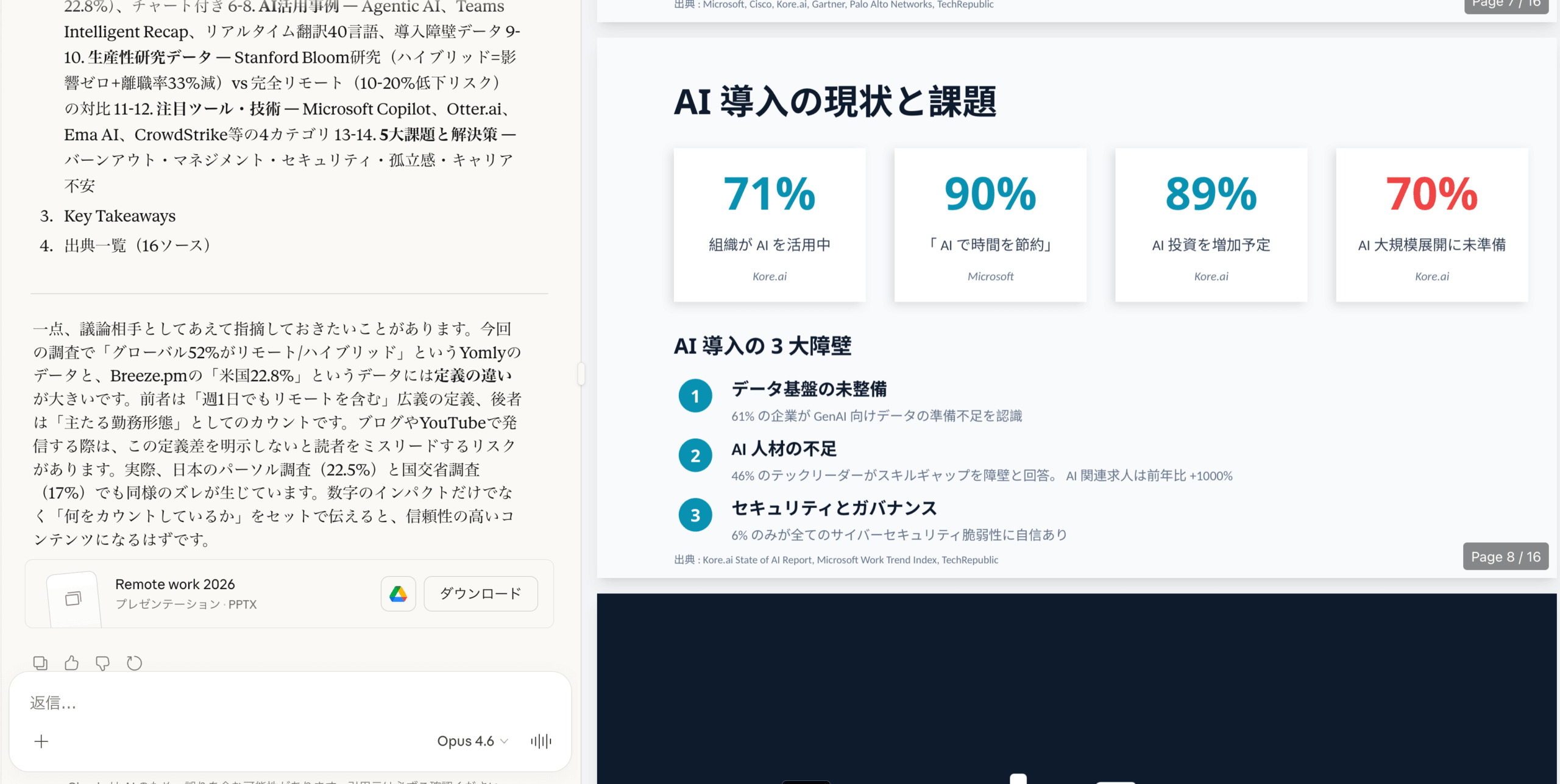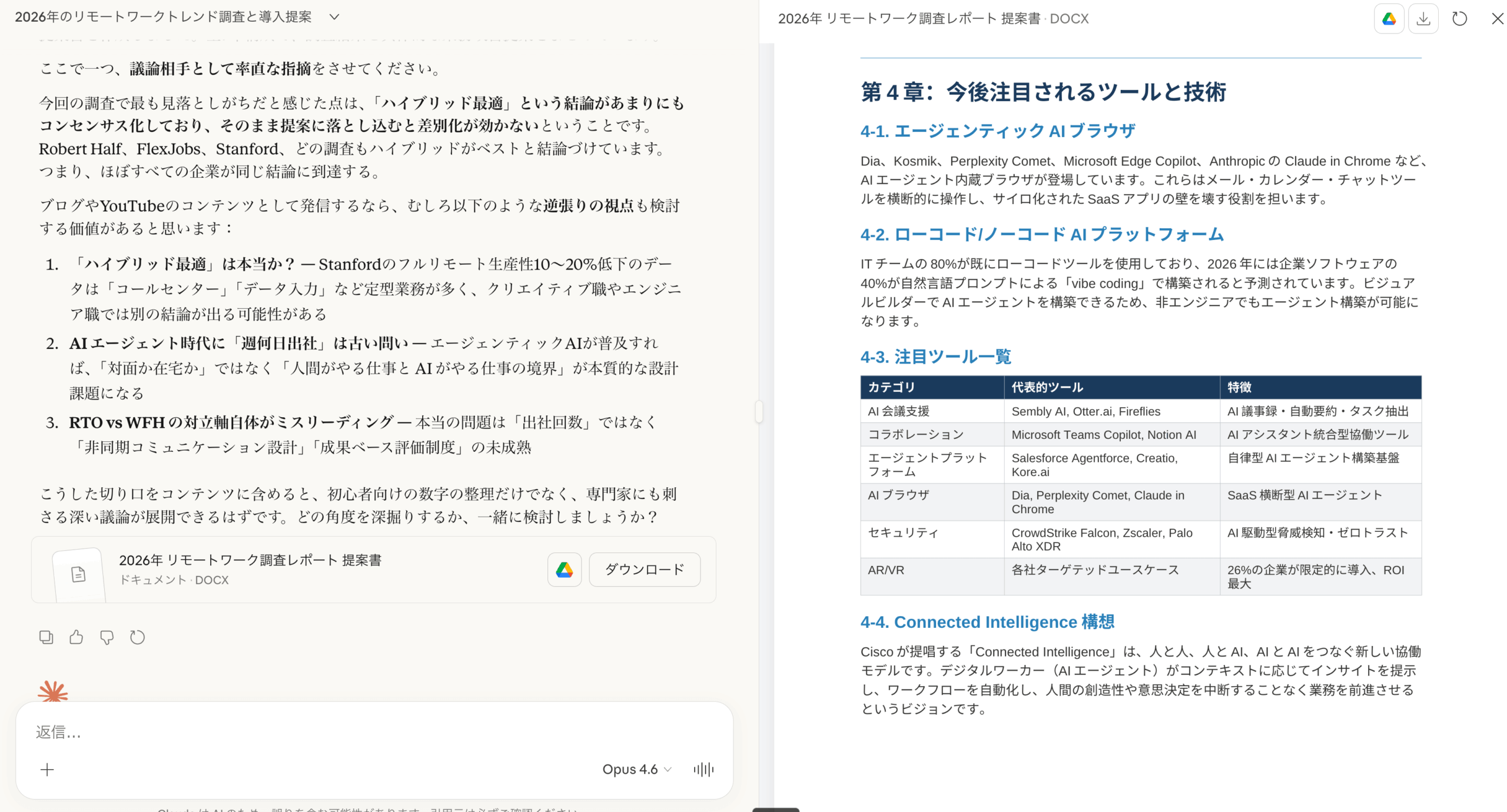 実際にClaude Opus 4.6でドキュメントを作成してみました。「リモートワークのトレンドを調査して、その調査結果に対して業務にどのように取り入れるかの提案書を作成してください」とプロンプトを入力すると、しっかり分析してドキュメントの形式で自動生成してくれます。これは最近のOpus 4.5から実装された機能ですが、4.6でさらに洗練されました。