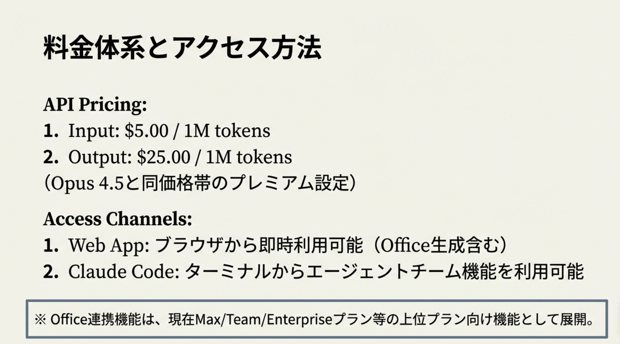 • 価格は前世代と同等で$5/$25(入力/出力)、性能向上で実質コスパ大幅改善