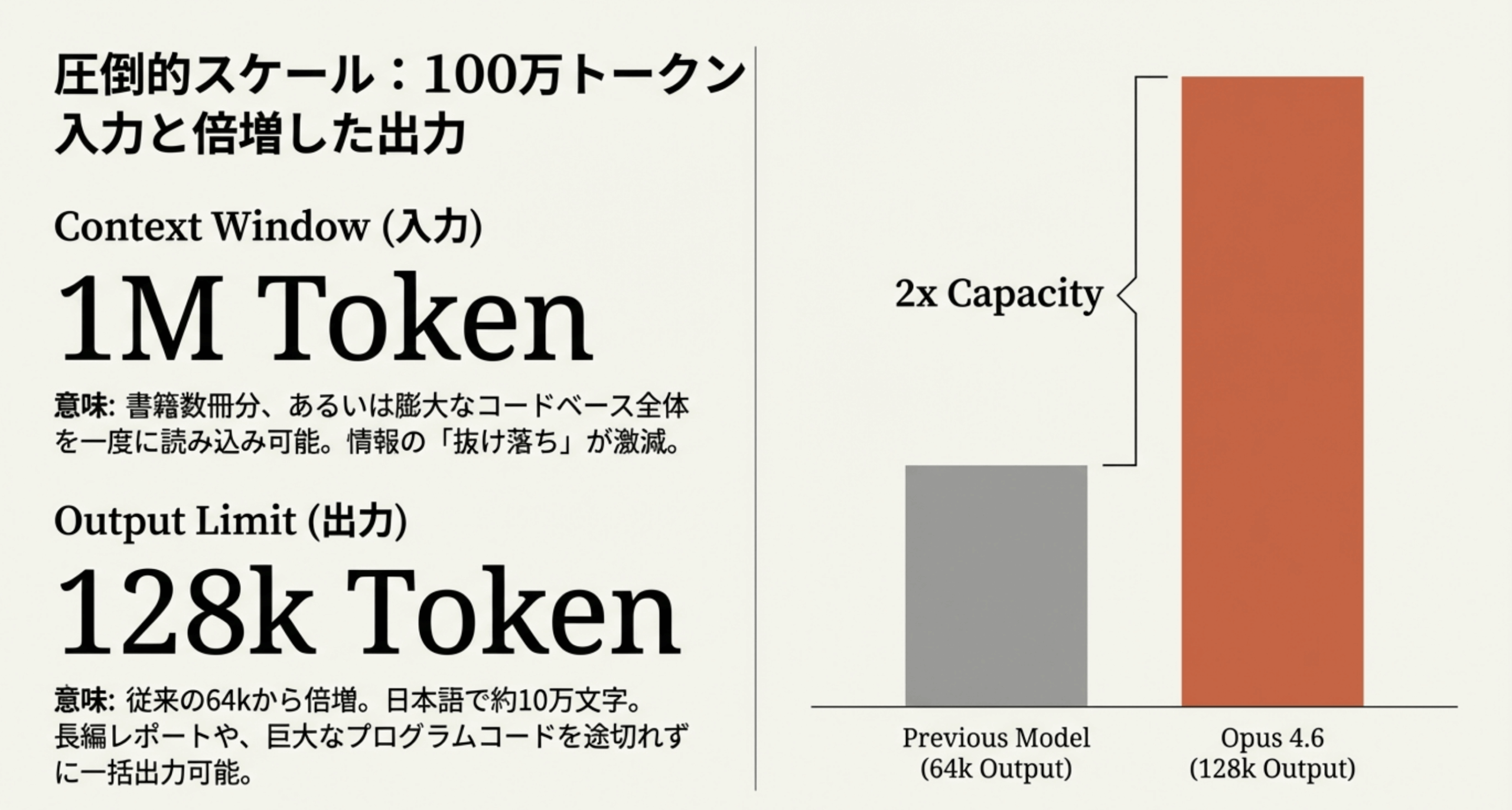 • 2026年2月5日リリースのClaude Opus 4.6は100万トークンのコンテキストウィンドウに対応し、本750冊分の情報を一度に処理可能