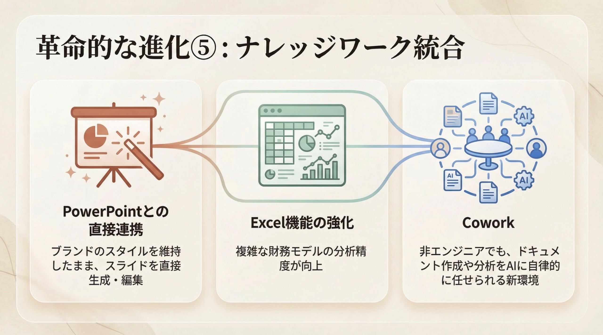 • PowerPoint・Excel統合が実務レベルに到達し、型崩れなしで即座に業務で使える品質を実現