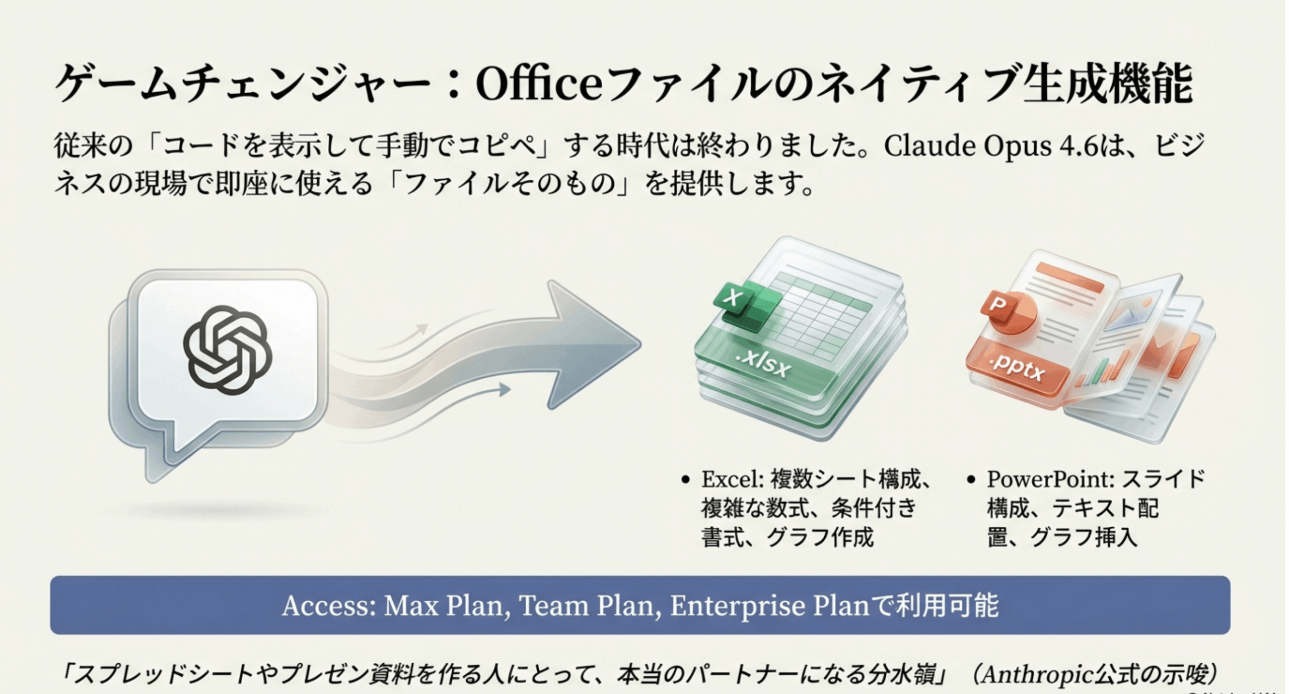 今回のアップデートで、PowerPointExcelとの連携が圧倒的にシームレスになりました。従来はGammaやCanvaなどのプレゼンツールが主流でしたが、Claudeが一気に実用レベルに到達しました。
