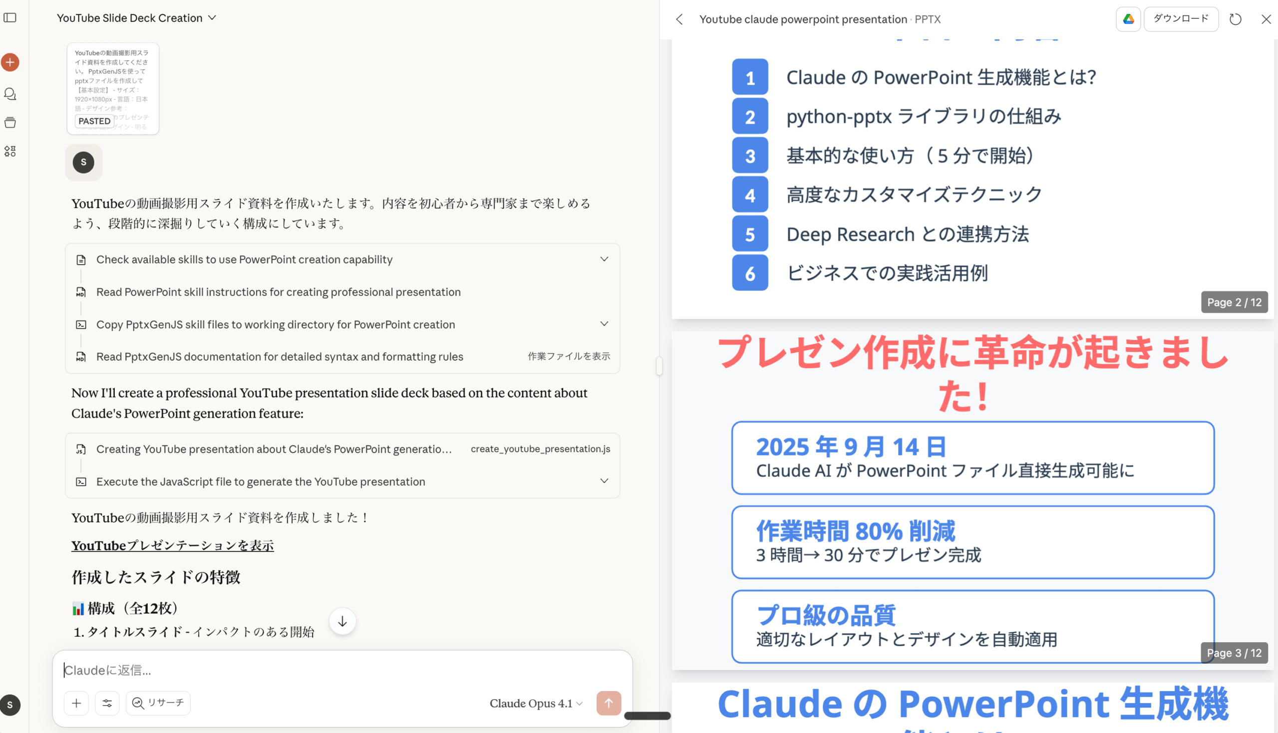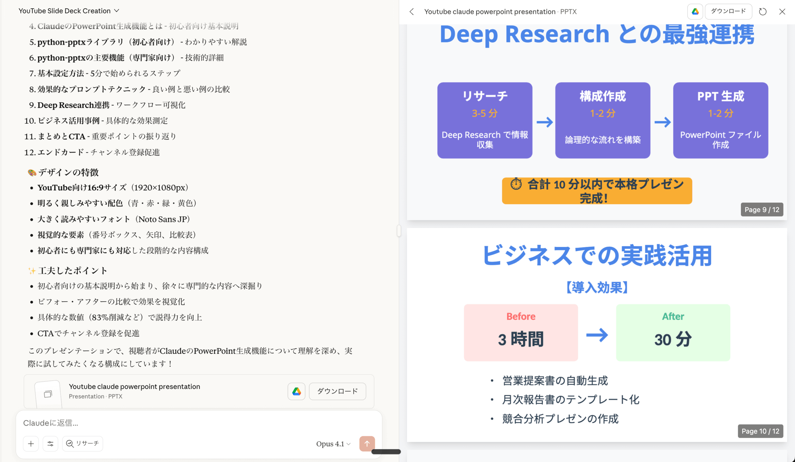 しかも、裏側で動くPptxGenJSライブラリを理解すれば、生成精度を劇的に向上させることができ、Deep Researchと組み合わせることで、リサーチからプレゼン完成まで10分以内で実現可能になりました。
