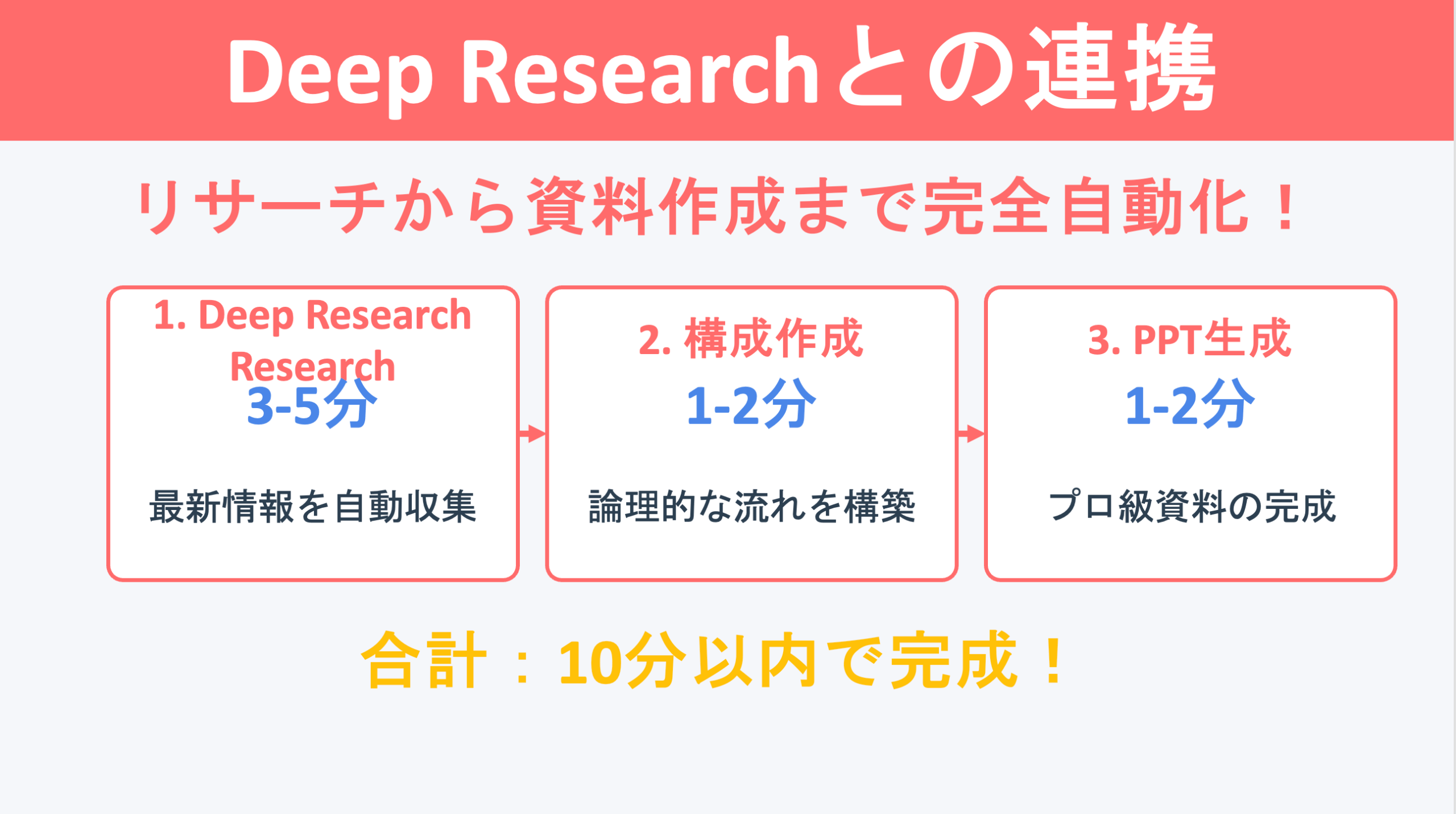 - Deep Researchとの連携でリサーチから資料化まで10分で完了