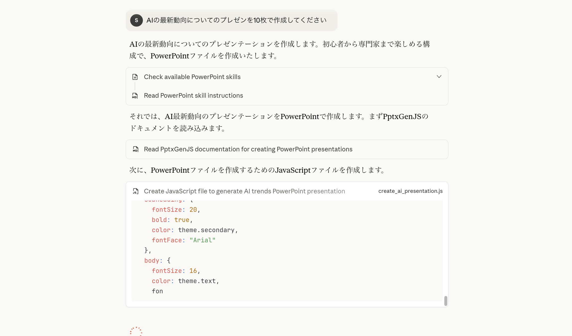「PptxGenJSを使って、先ほどの構成でPowerPointファイルを作成してください。addSlide()でスライドを追加し、addText()でコンテンツを追加してください」で実際のファイルを生成します。