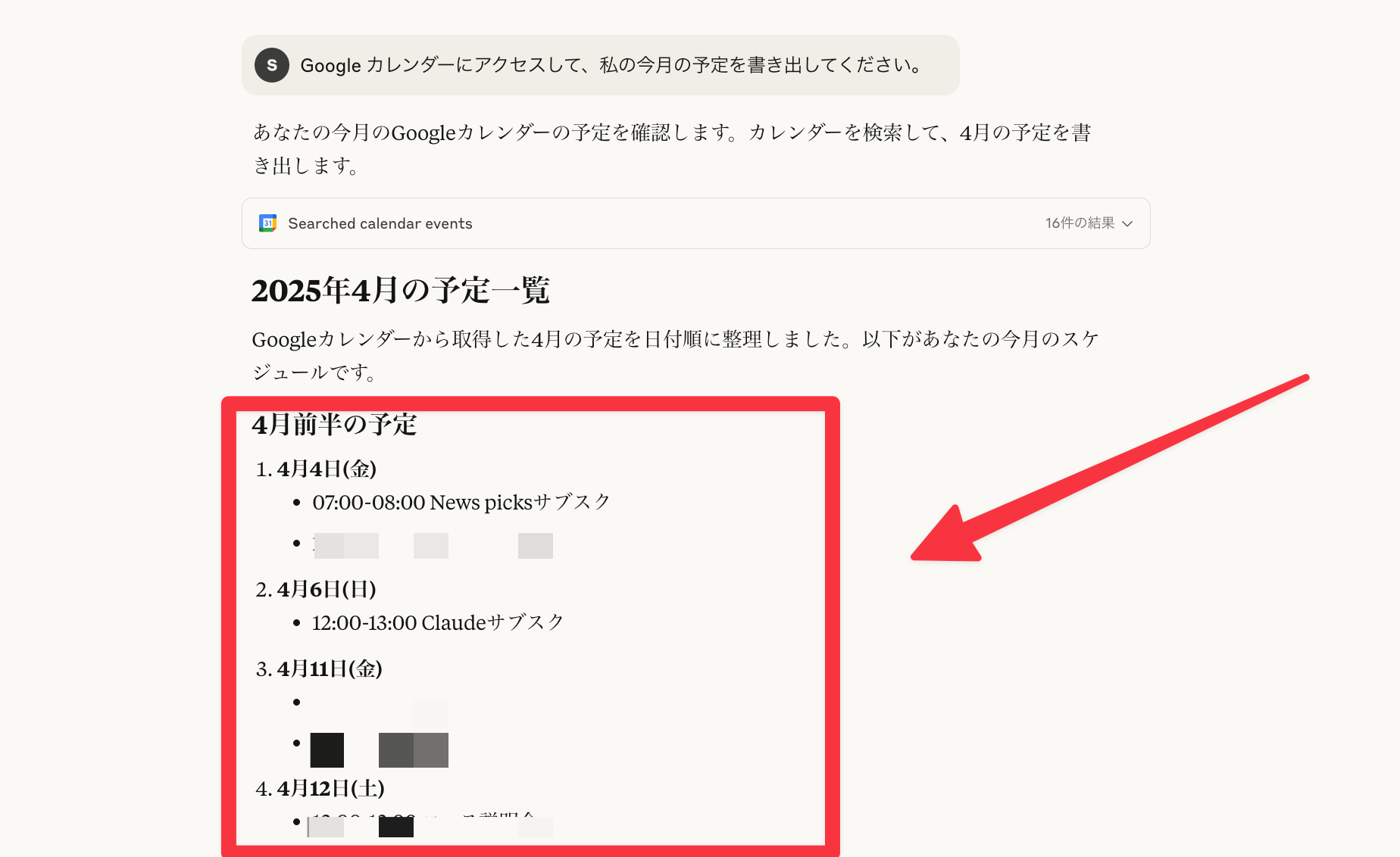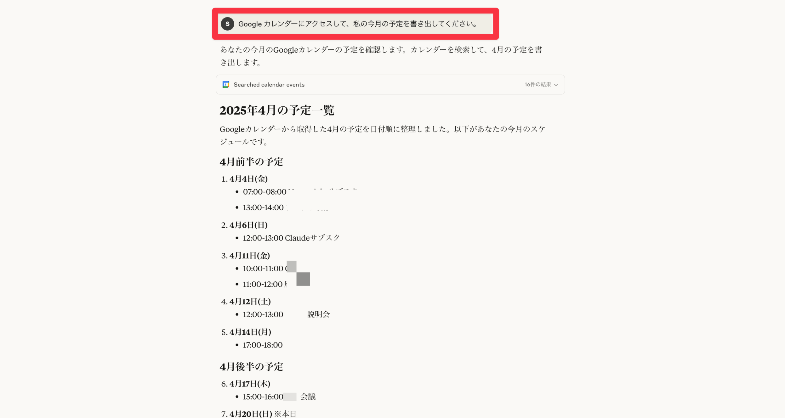 続いて紹介するのが、google カレンダーとの連携についてです。Googleカレンダーも同様に連携でき、「今月の予定を確認して一覧でまとめてください」というプロンプトで予定を一覧化できます。予定がたくさん詰まっているユーザーにとって、予定の確認や空き時間の把握が簡単になります。