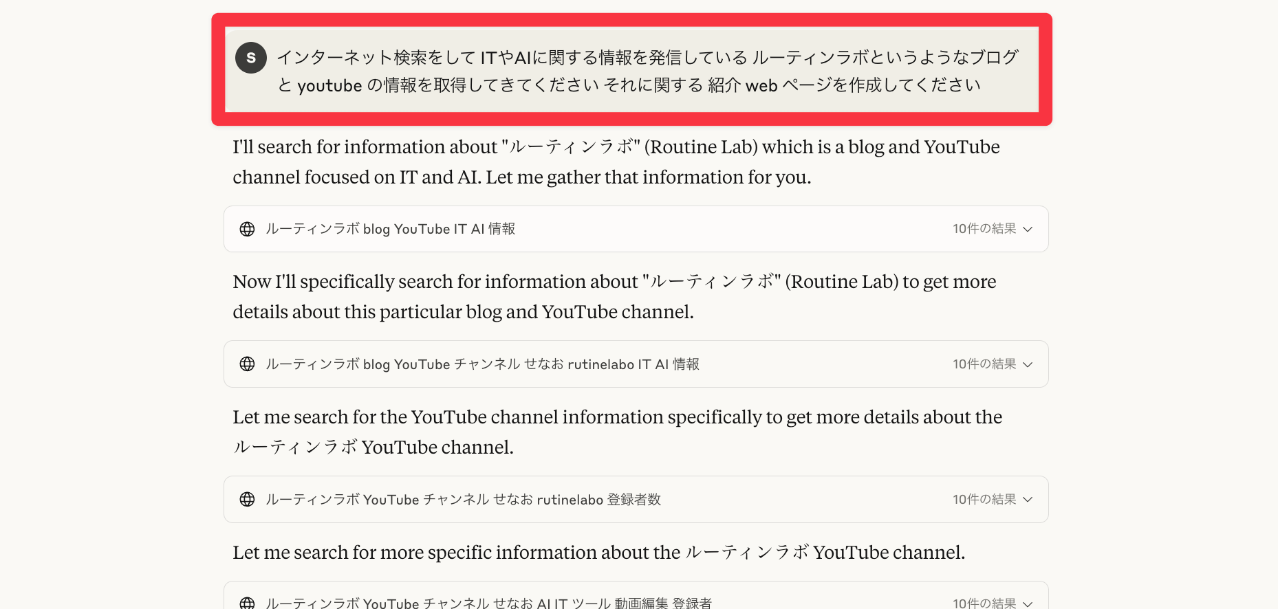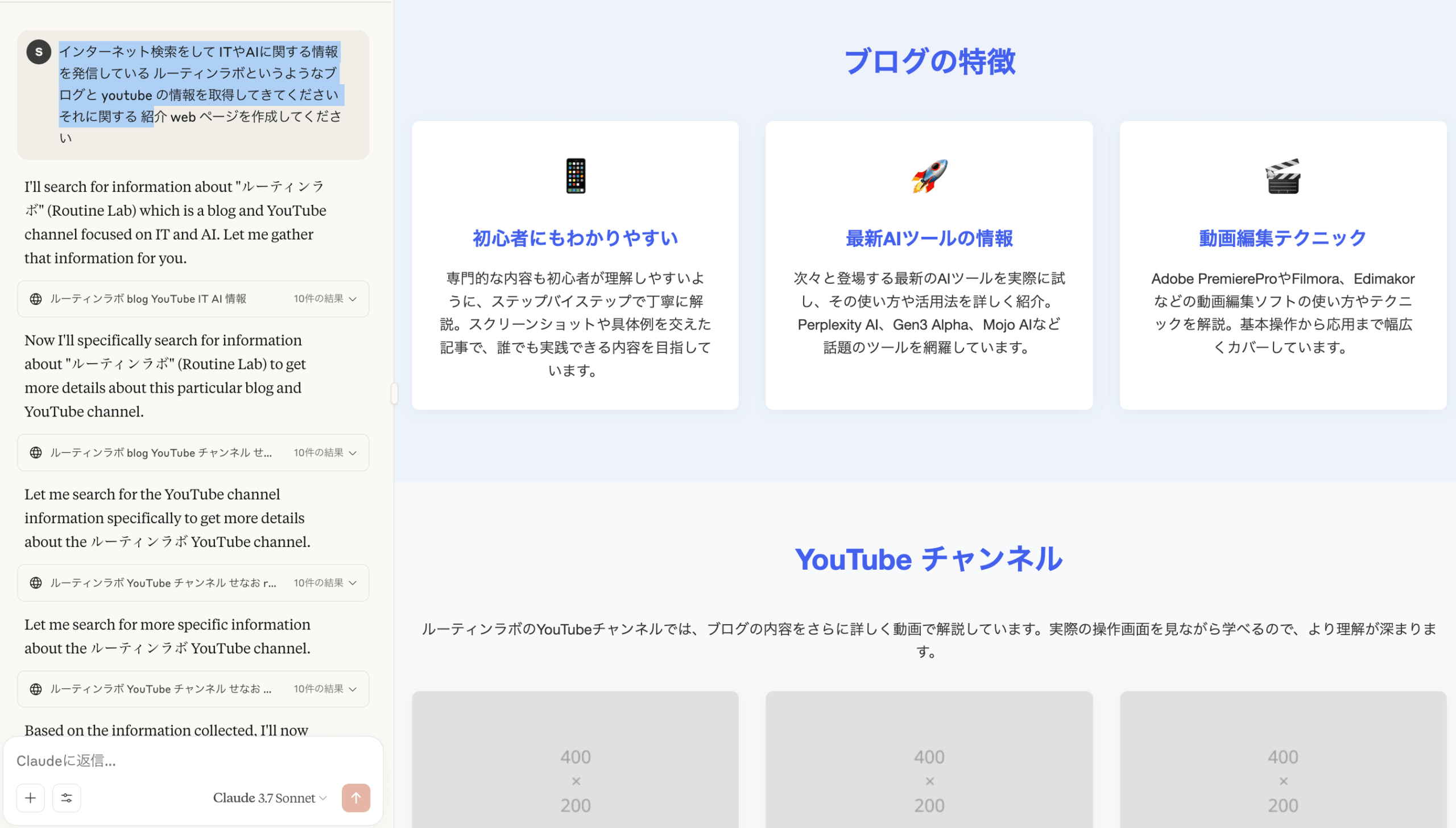 例えば「インターネットから情報を取得して、ルーティンラボというAIやITに関する情報を発信しているブログやYouTubeを紹介するページを作成してください」というプロンプトを投げると、Claudeは情報を検索した後、HTMLベースのコードを生成します。