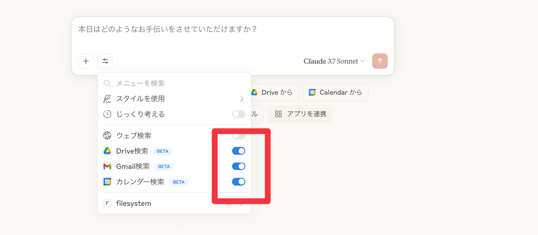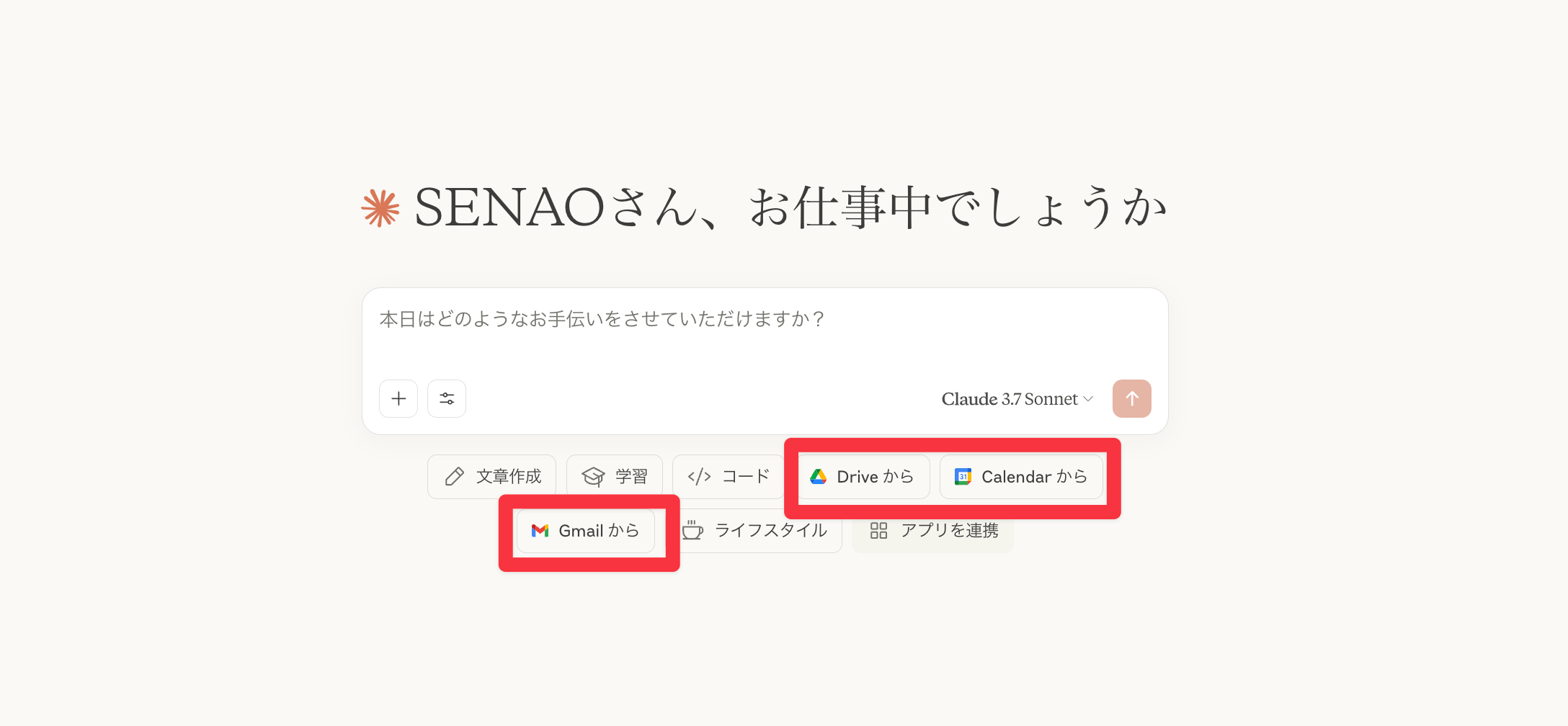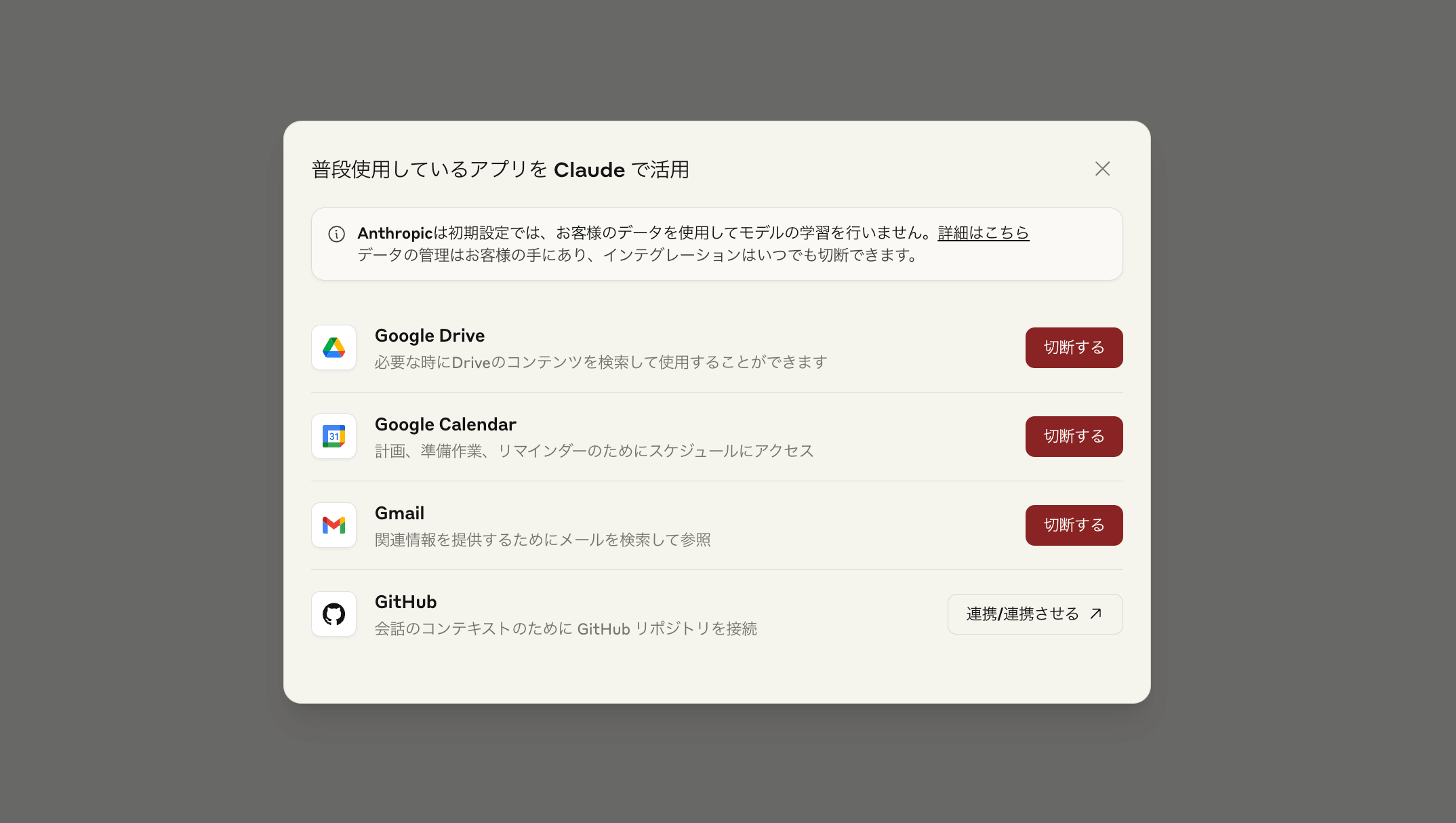 Googleドライブ、Gmail、Googleカレンダーとの連携も可能になり、業務効率化に大きく貢献する機能が追加され、Claudeは単なるテキスト生成AIから、日常業務をサポートするAIアシスタントツールに。