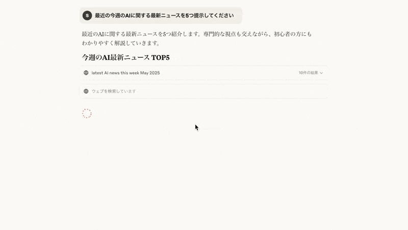 Web検索機能を使うと、例えば「最近の今週のAIに関する最新ニュースを5つ提示してください」というプロンプトに対して、インターネットから最新情報を取得して整理してくれます。検索速度も生成速度も非常にスムーズで、ストレスなく使えるのが特徴です。