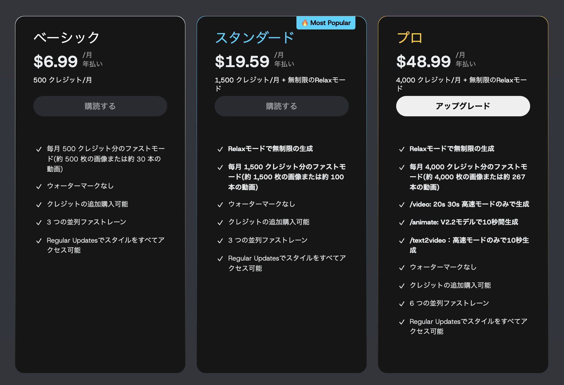 - 高画質化処理: 5〜15クレジット(解像度により変動)