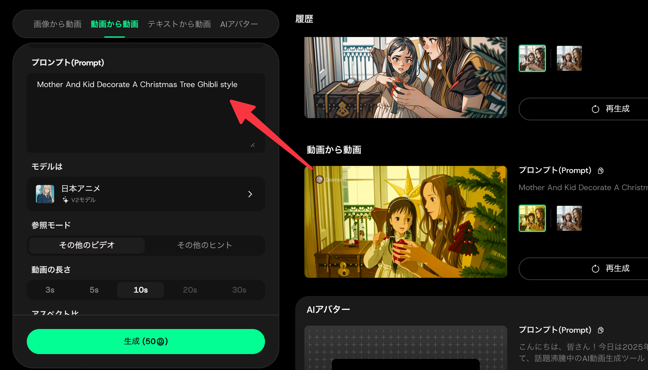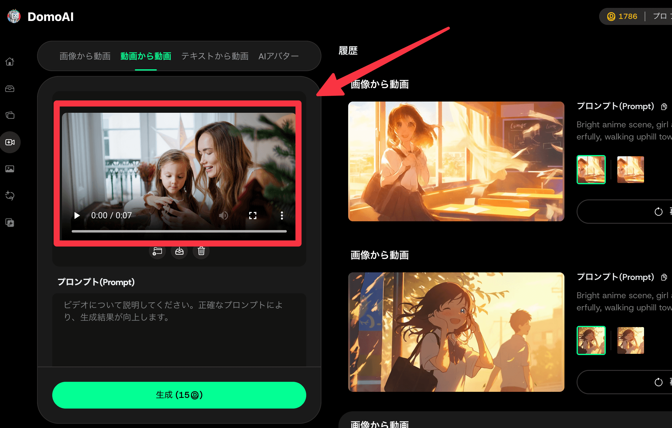 DomoAIの最も人気の高い機能の一つが、ジブリ風アニメーション動画の生成です。以下の手順で、誰でも簡単にスタジオジブリのような美しい動画を作成できます。