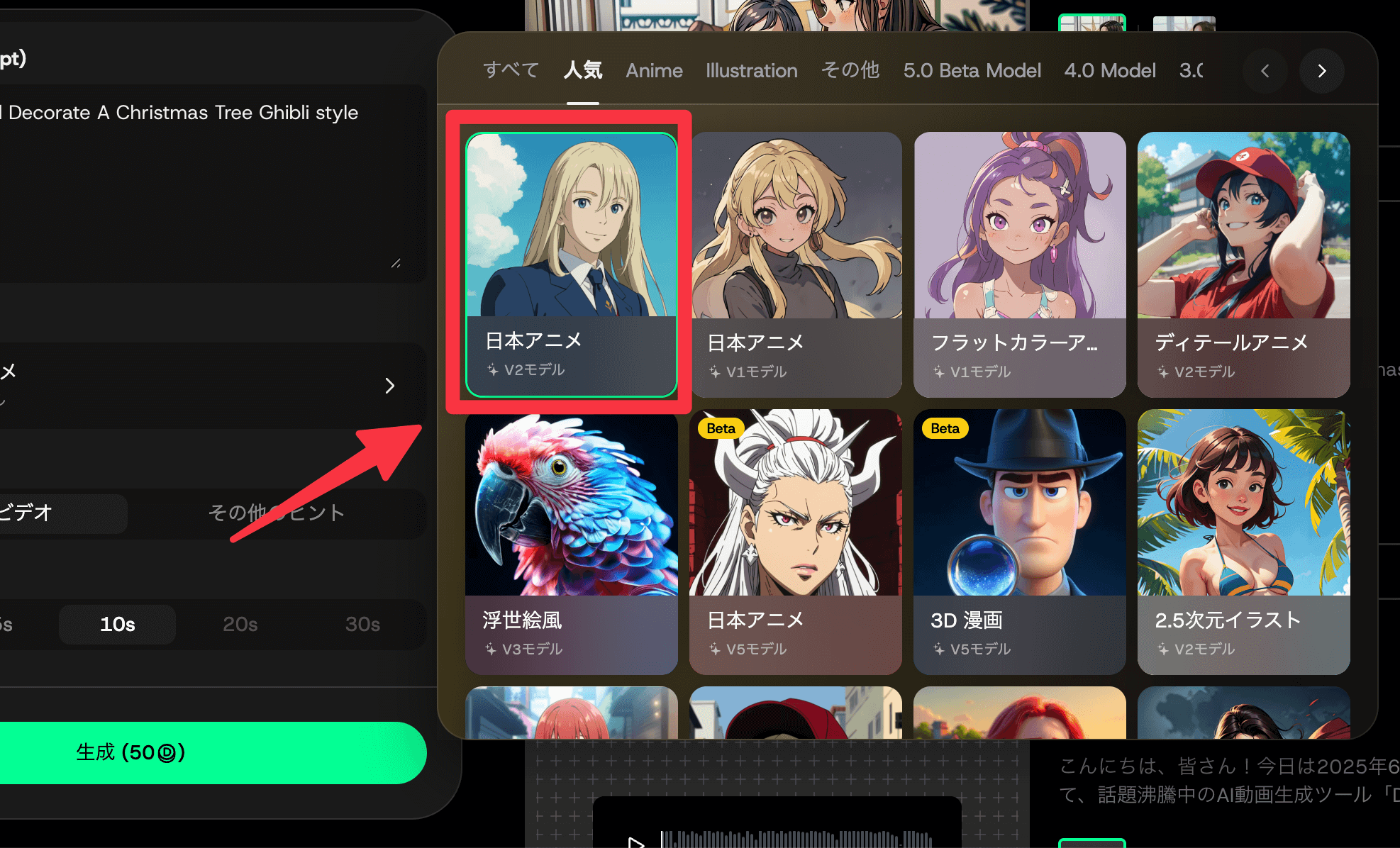 「Studio Ghibli style, beautiful animation」などのプロンプトを入力し、「日本アニメ」モデルを選択します。