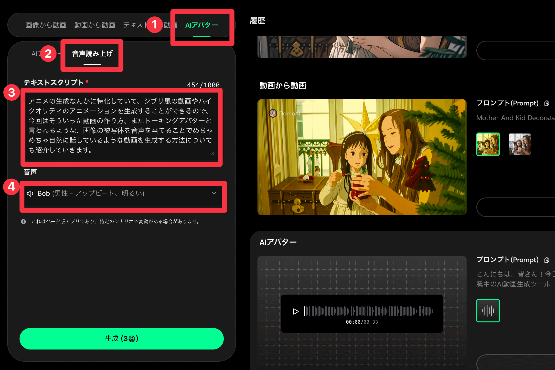 - 動画生成: AI技術により自然で滑らかな動画を自動生成