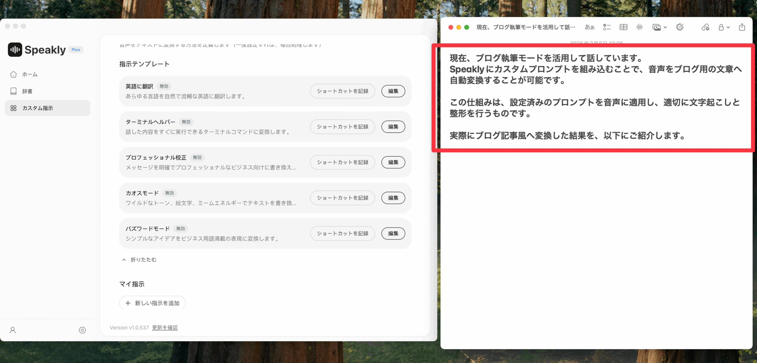 - カスタムプロンプトでブログ・メール・SNS投稿が話すだけで完成