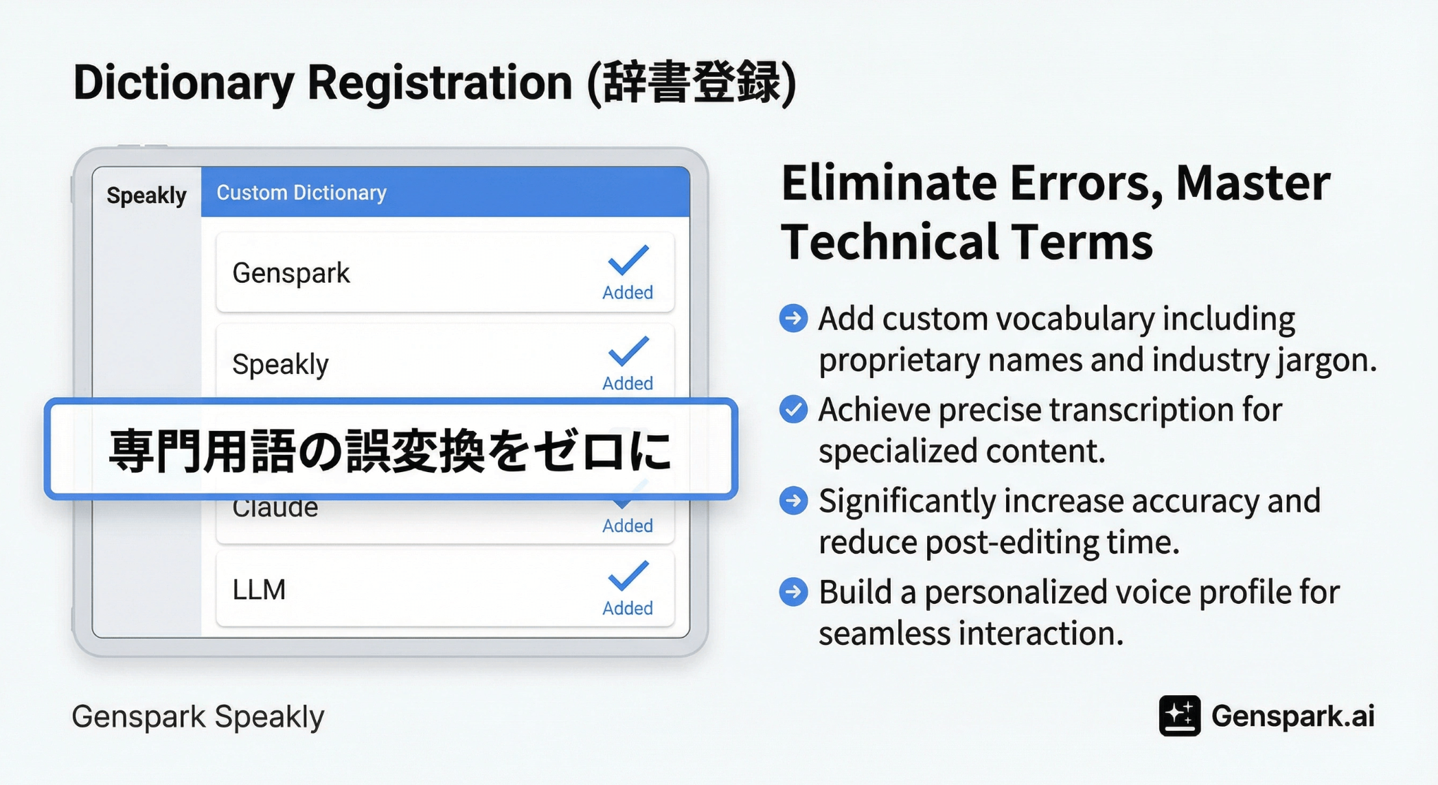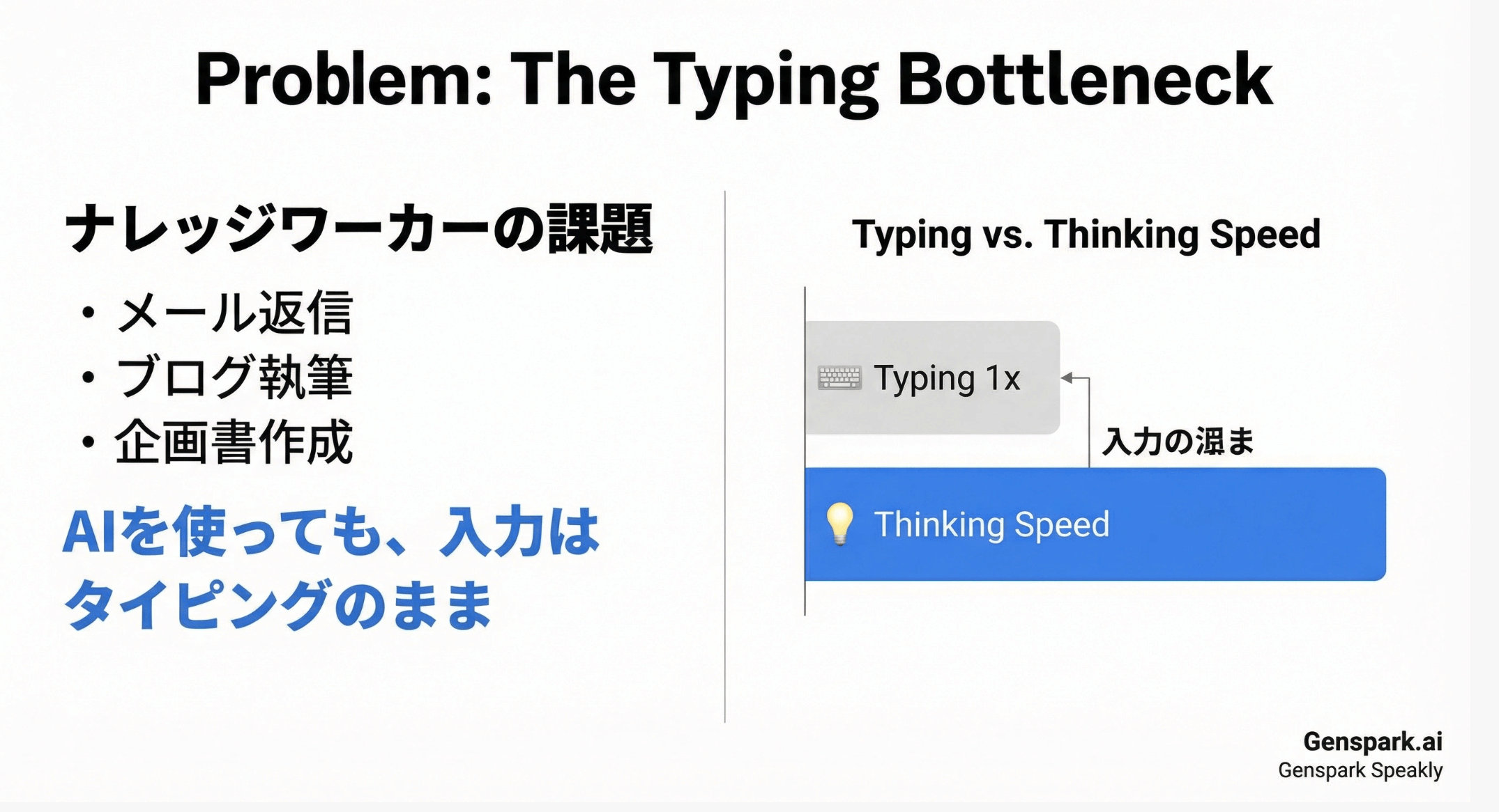 - Genspark Speaklyはタイピングの4倍速を実現する無料の音声入力AIで、フィラーワード自動削除や文章整形が可能