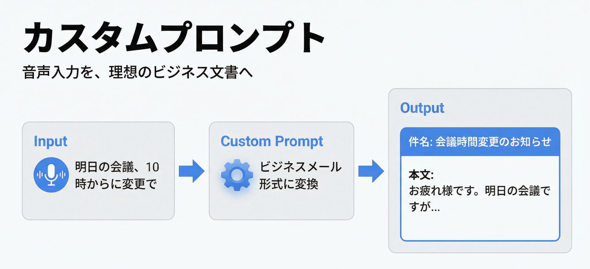 | カスタムプロンプト | 音声入力の裏側にプロンプトを埋め込み、用途別の文章変換を実現 |