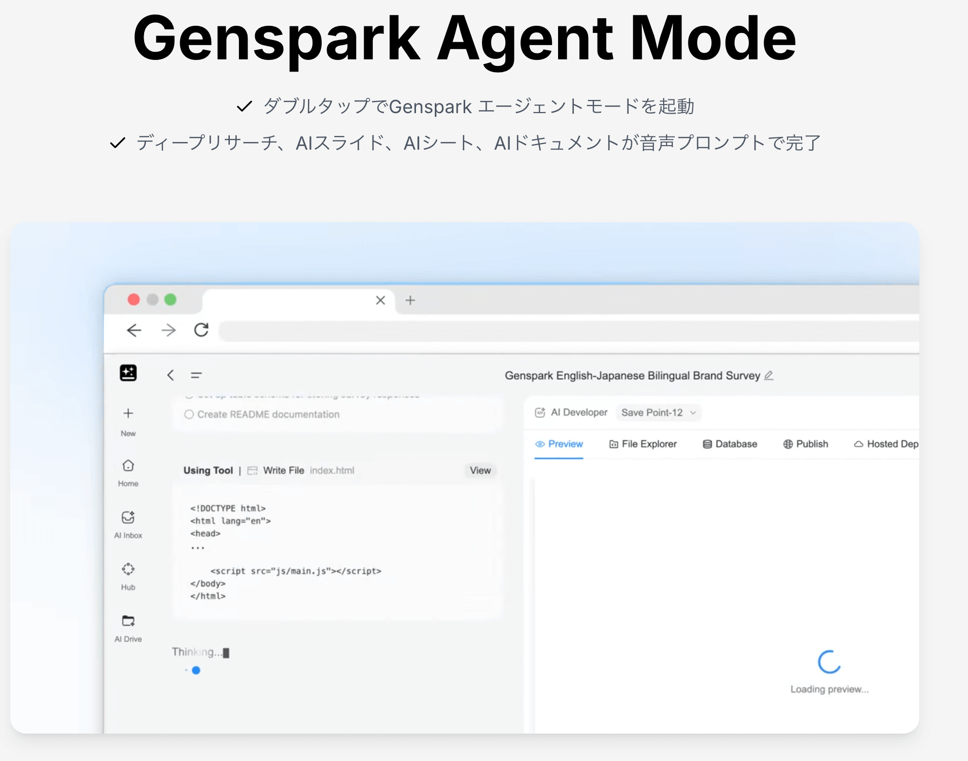 - Gensparkのエージェント機能と直接連携し、音声だけでリサーチから資料作成まで完結できる