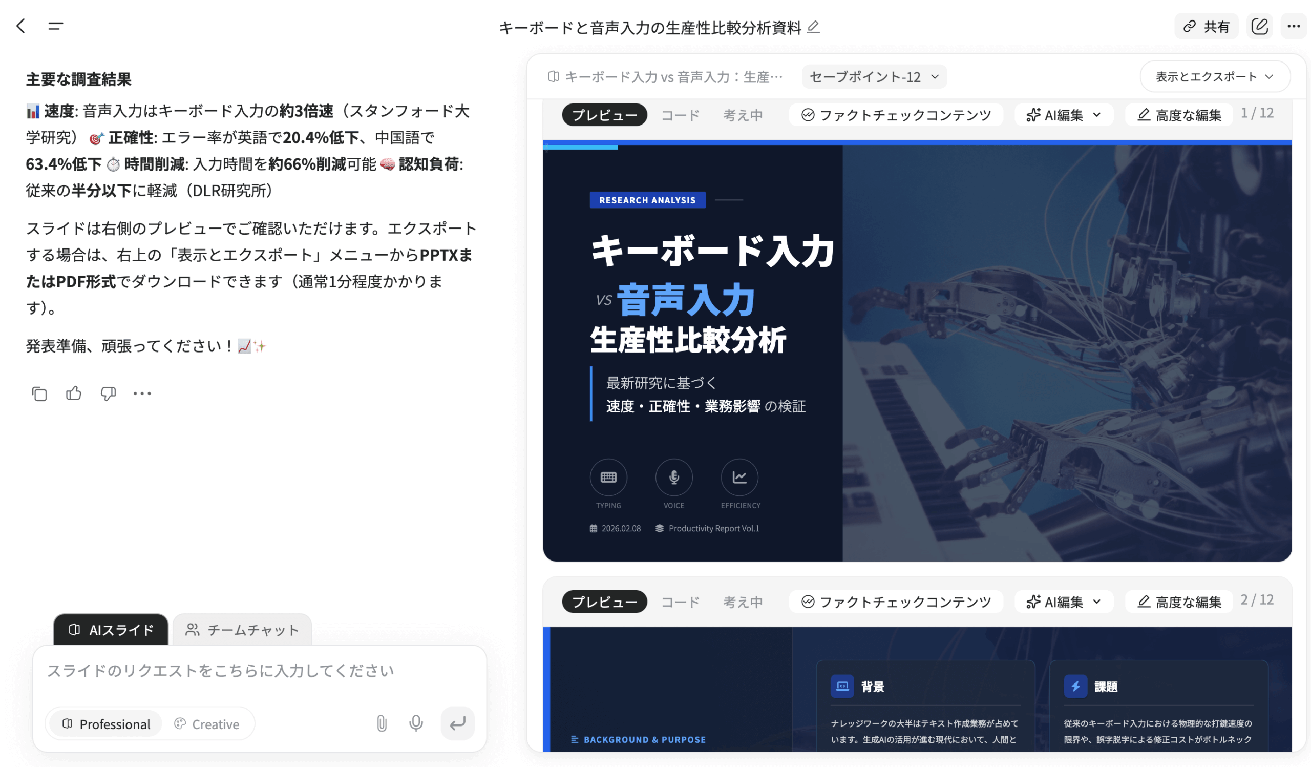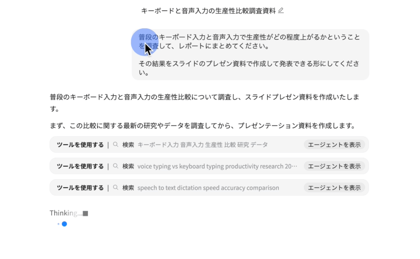 「キーボード入力と音声入力の生産性の差を調査して、レポートにまとめて、プレゼン資料を作成してください」のように音声で指示を出すだけで、Gensparkのエージェントが自動で処理を開始します。
