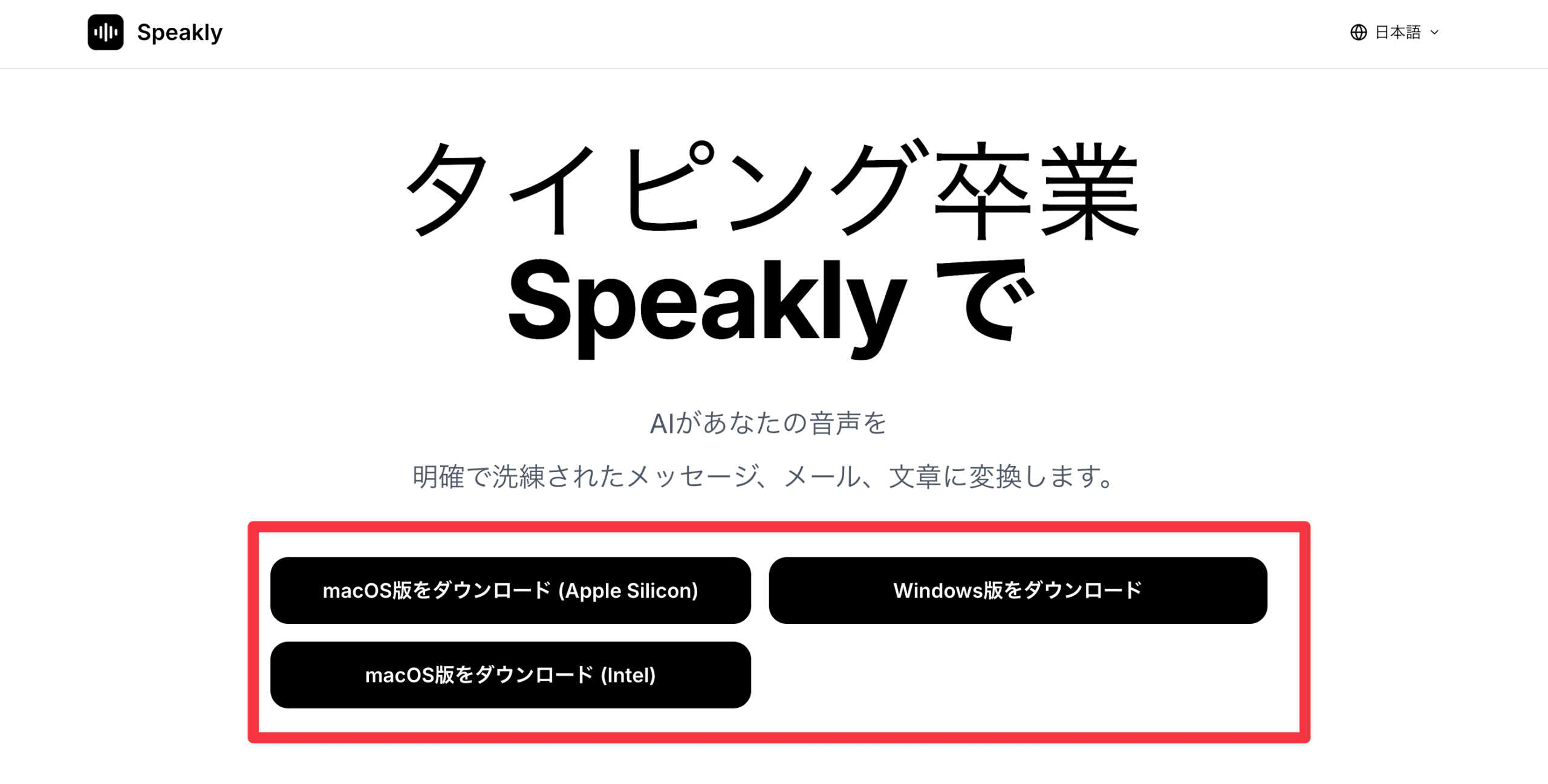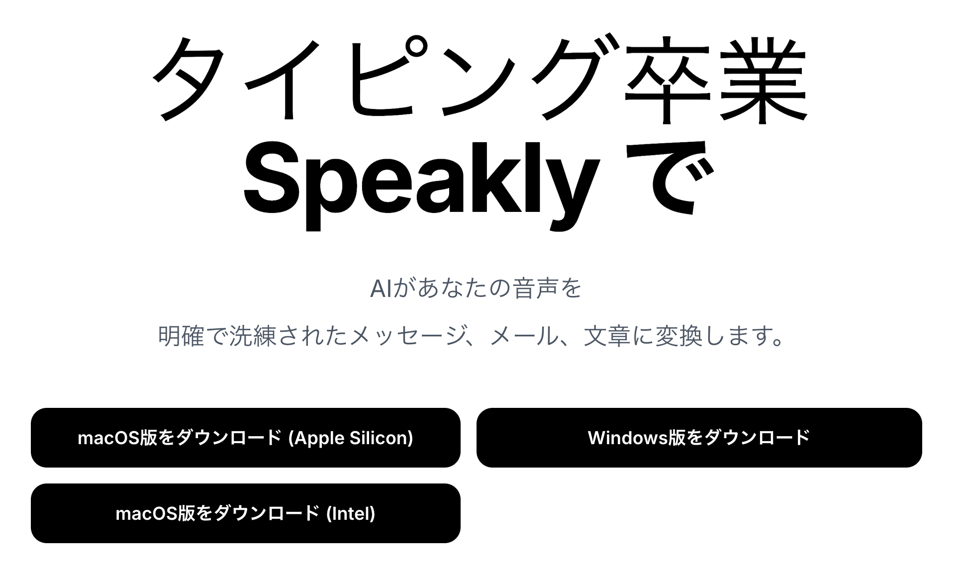 Speakly公式サイトにアクセスし、お使いのOSに合わせたソフトをダウンロードします。macOS(Apple Silicon / Intel)とWindowsに対応しています。ブラウザで動くサービスではなく、パソコンにインストールして使うソフトです。
