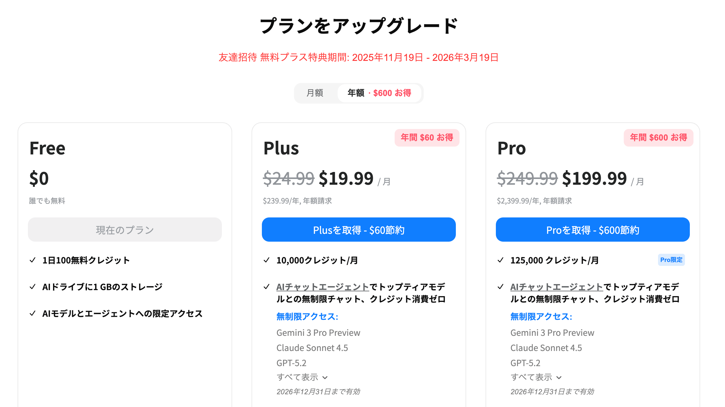 | Plus | $24.99 | $19.99 | 10,000/月 | 無制限AIチャット・50GBストレージ |