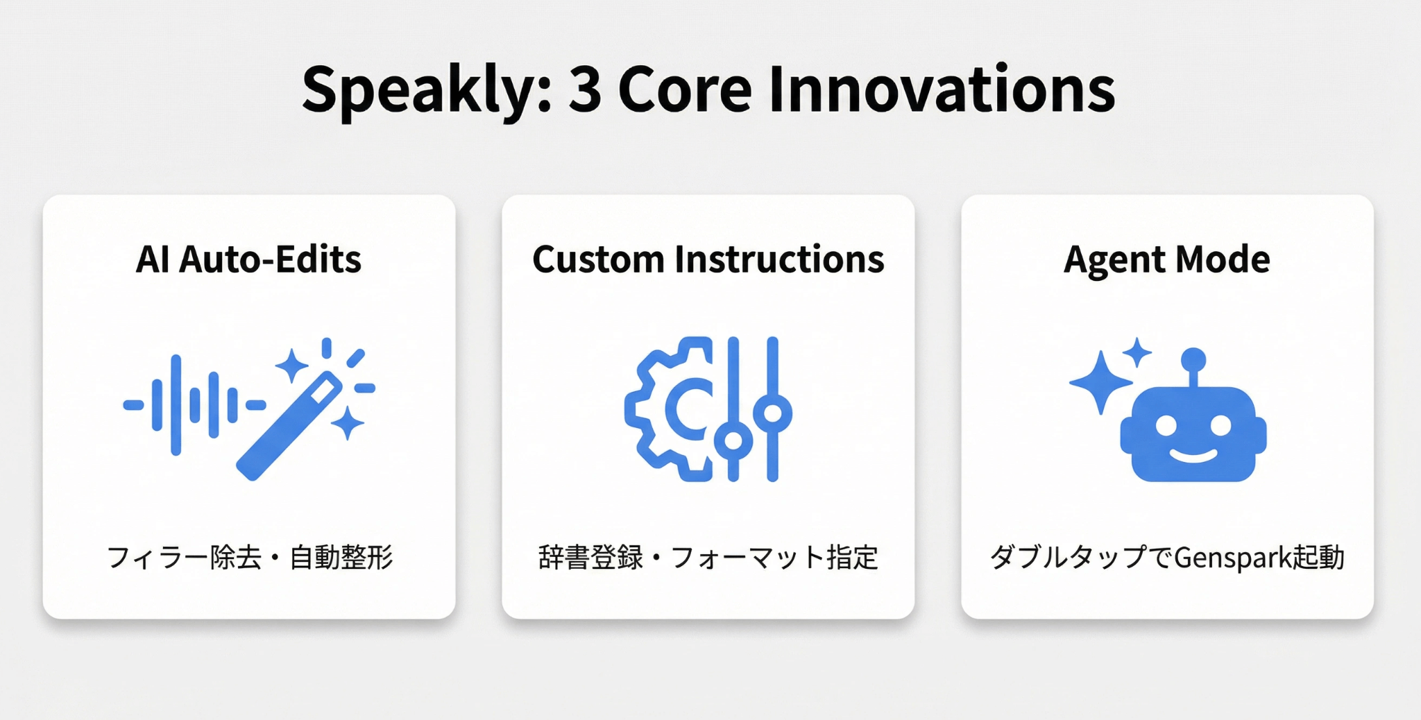 Gensparkの「Speakly」は、単なる音声入力ツールの枠を超えた次世代の音声入力AIです。