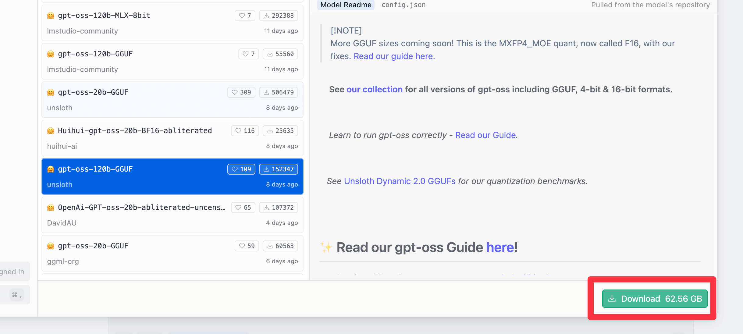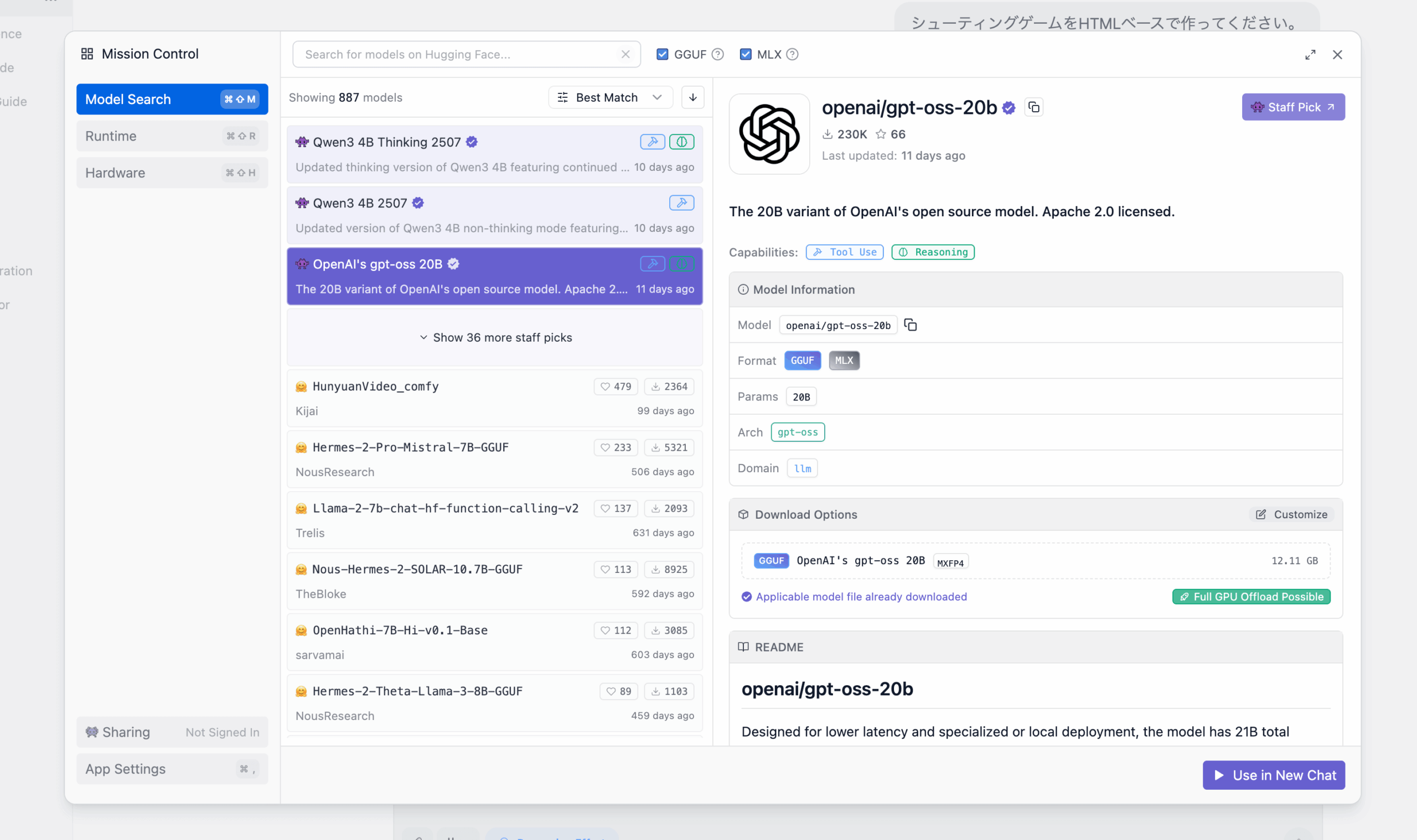 GPT-OSS-20bを選択し、右下の「Download」ボタンをクリック。約12GBのダウンロードが始まります(回線速度により5-15分程度)。プログレスバーで進捗を確認できます。