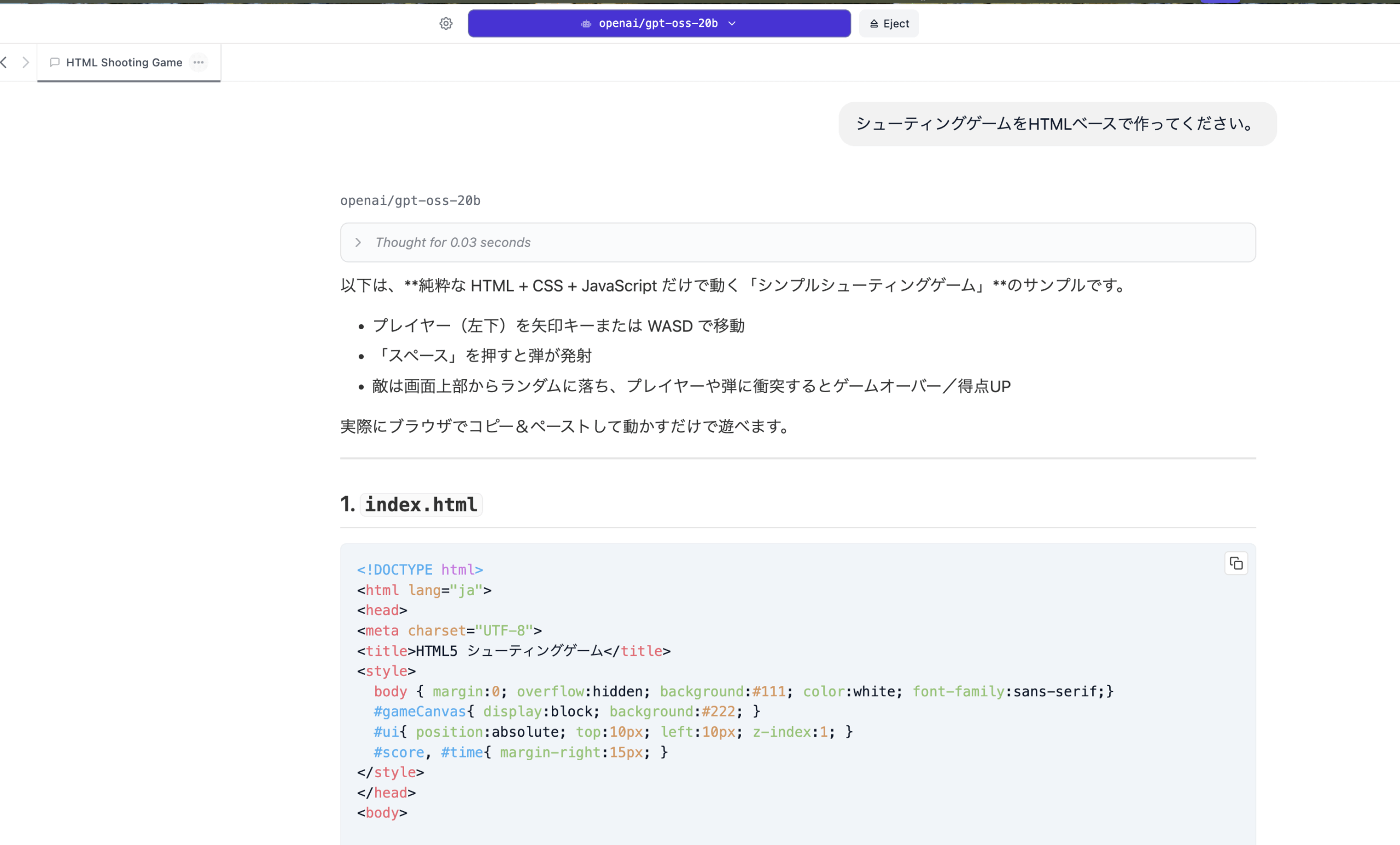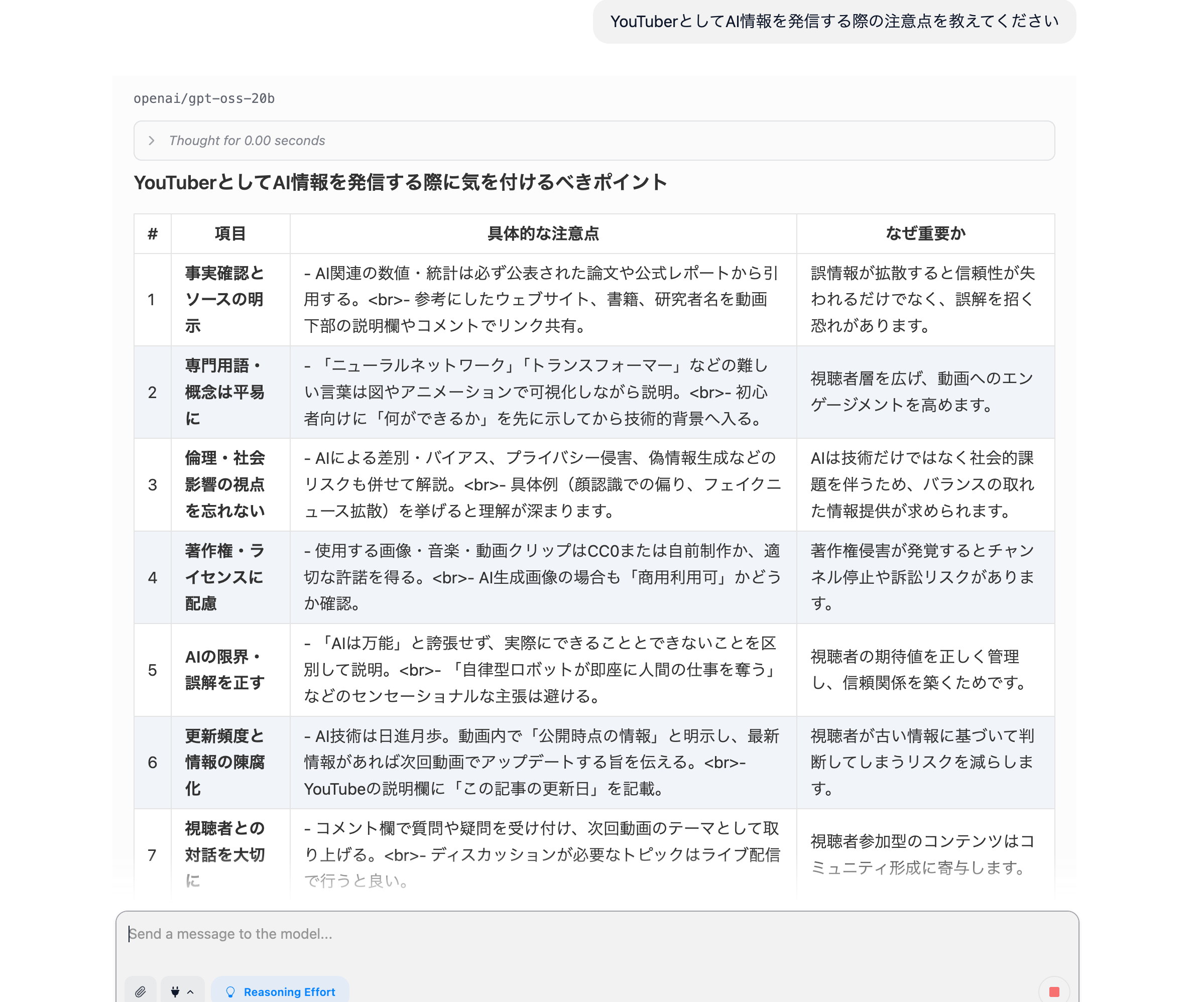 ダウンロード完了後、上部のモデル選択メニューからGPT-OSS-20bを選び、チャット画面で質問を入力。Enterキーで送信するだけで利用開始できます。