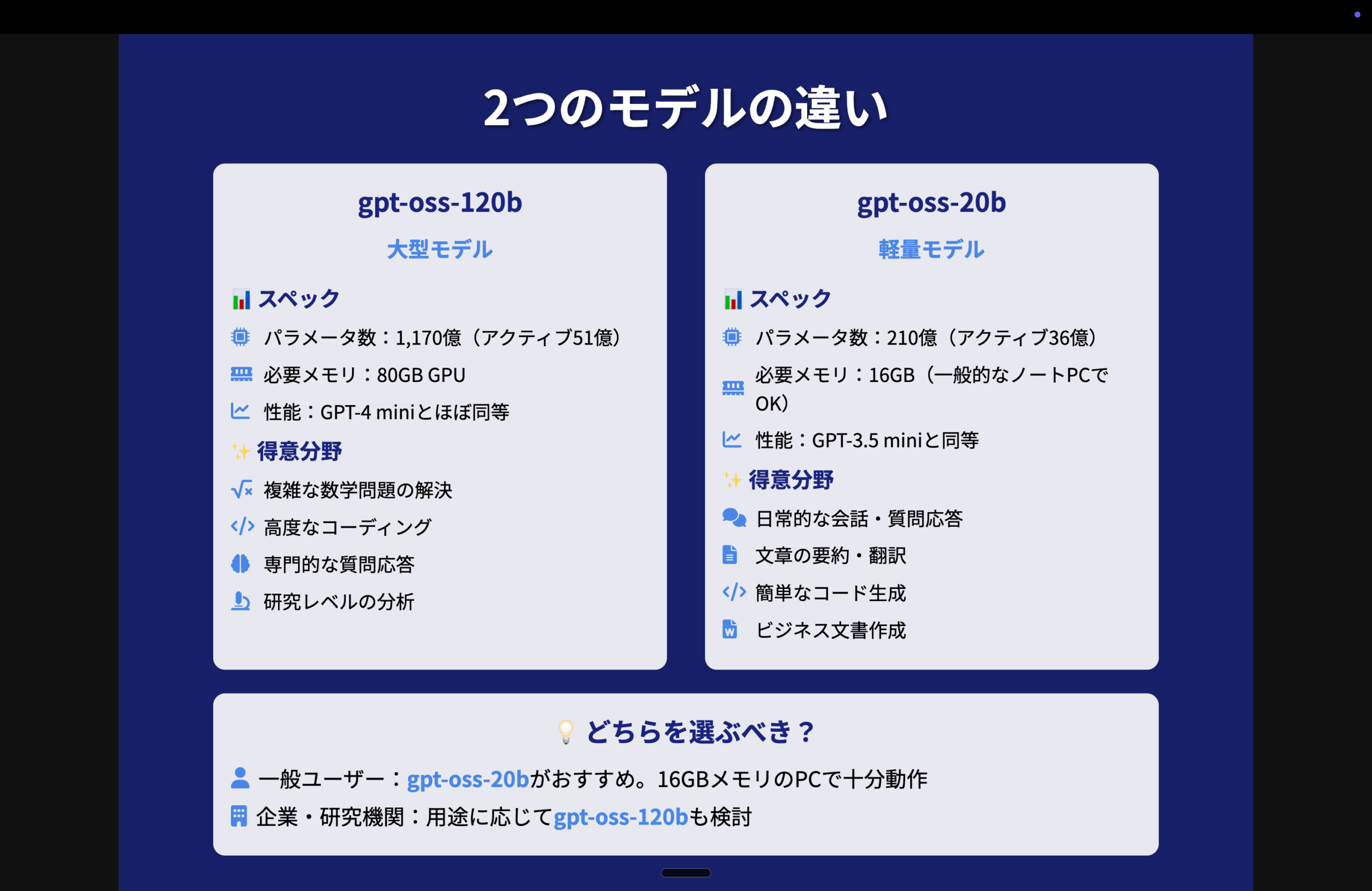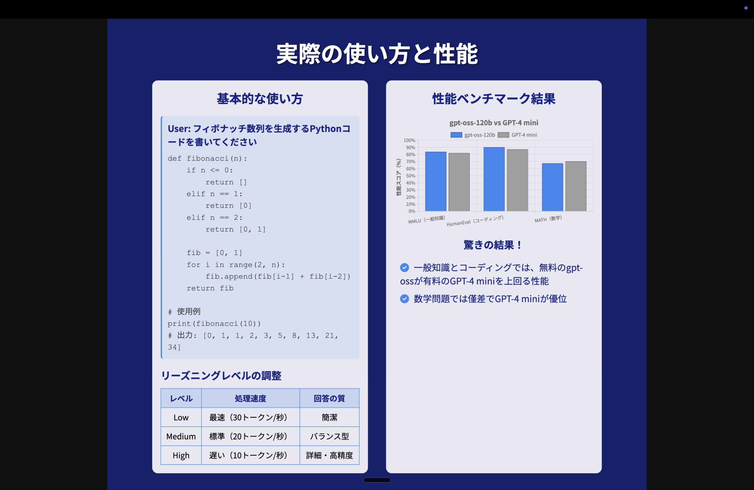 従来のChatGPT Plusが月額3,000円、年間36,000円かかることを考えると、GPT-OSSの無料提供は革命的です。企業の機密情報処理や教育現場での個人情報保護など、セキュリティが重要な場面で特に威力を発揮します。