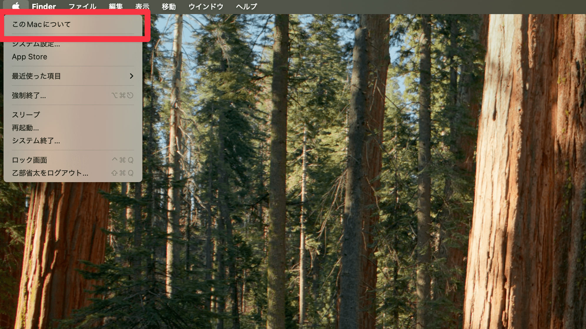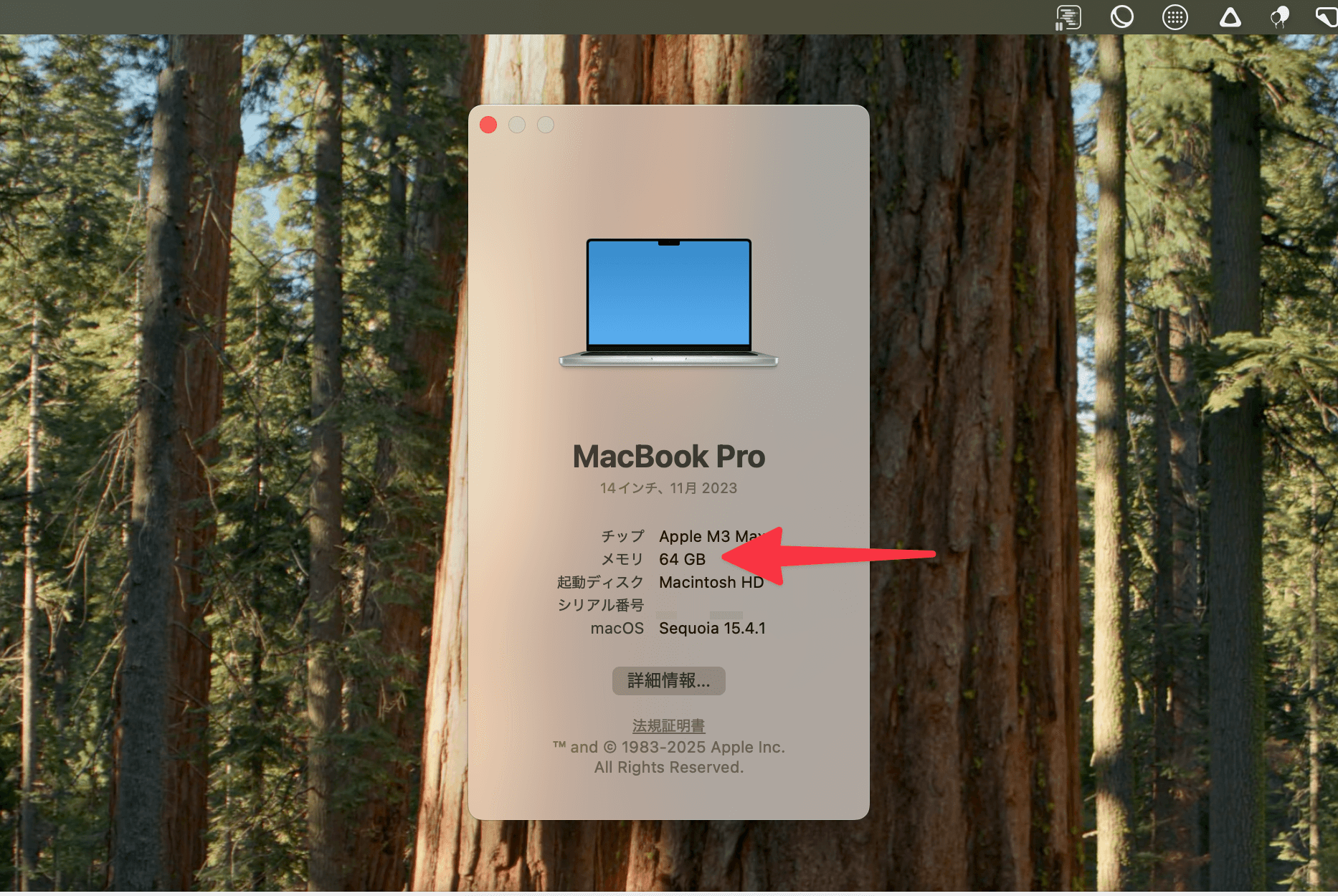 私は現在MacBookを使用しているので、Macの確認方法は以下のような図です。Windowsユーザーの方も上記の手順に沿って、あなたの使用しているPCのスペックを確認してみてください。