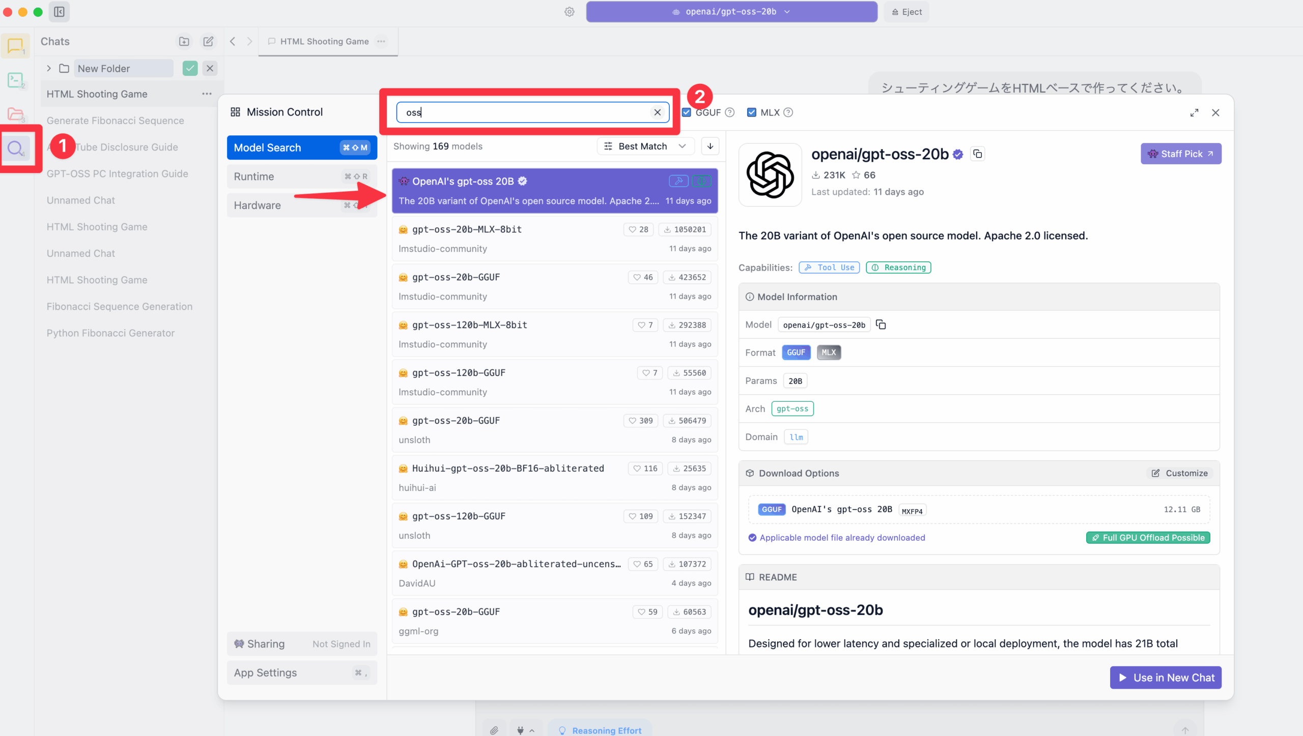 LM Studioを起動後、左下の「Discover」タブをクリック。検索バーに「GPT-OSS」と入力すると、OpenAI GPT-OSS-20bが最上位に表示されます。