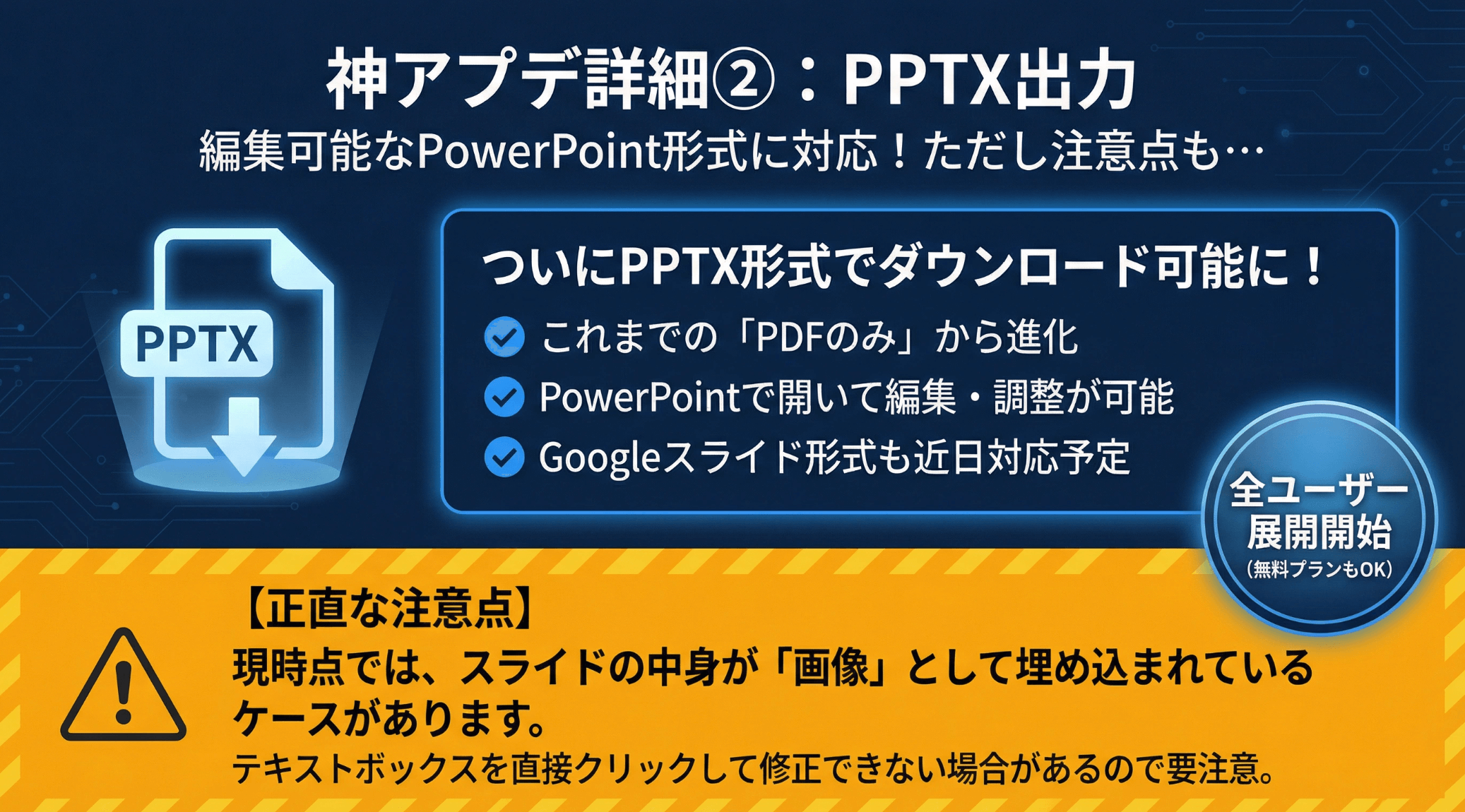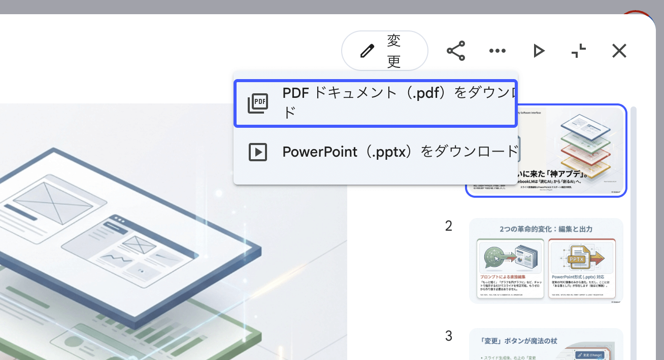 • PowerPoint(PPTX)形式でのダウンロード - 従来のPDF形式に加えてPPTX出力に対応