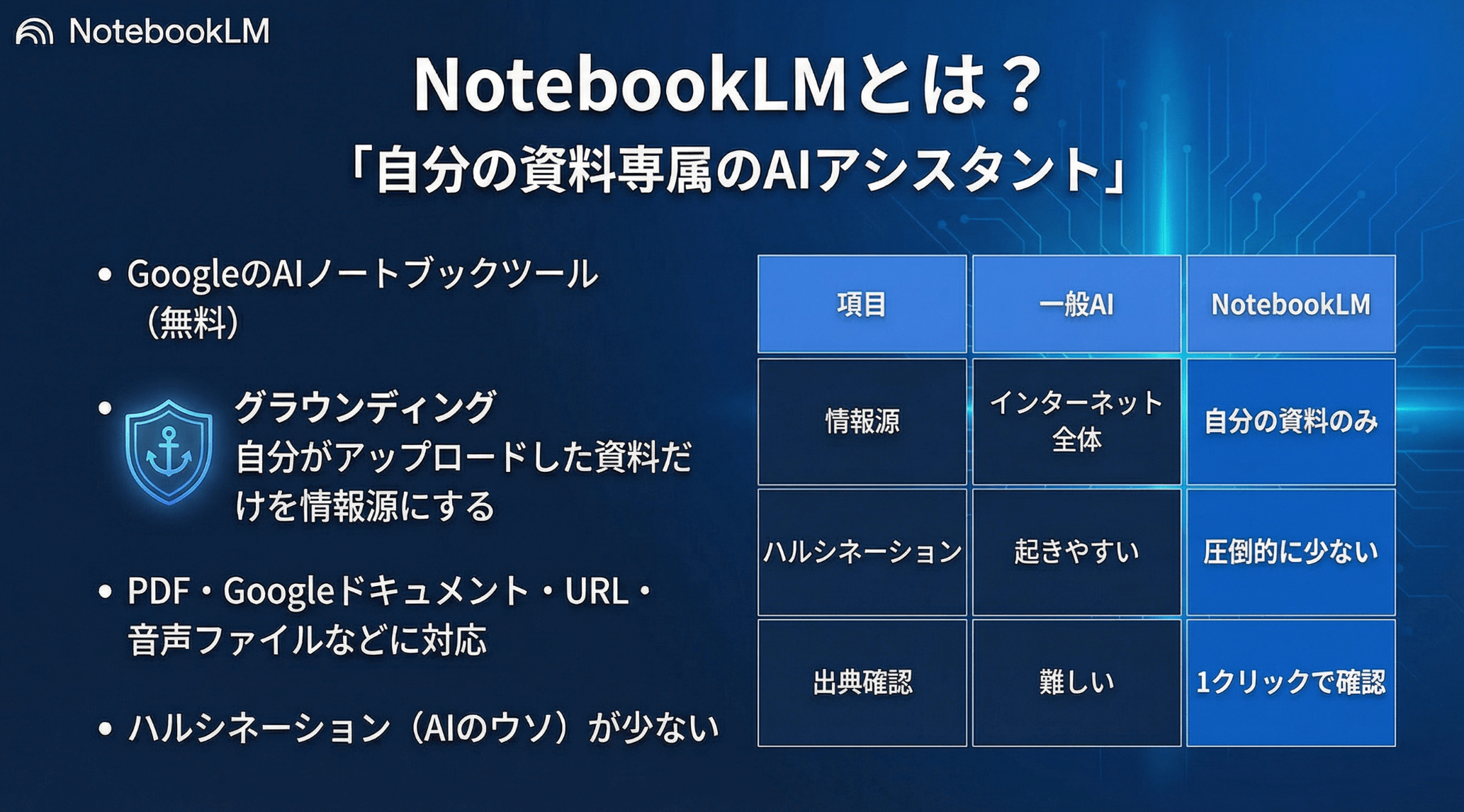 NotebookLMは様々な機能を搭載しており、簡単に言えば自分オリジナルのAIノートになります。このツールの便利なところが、従来のチャットベースのAIとは違って、取り込んだ情報のみでAIとやり取りができるといった点です。