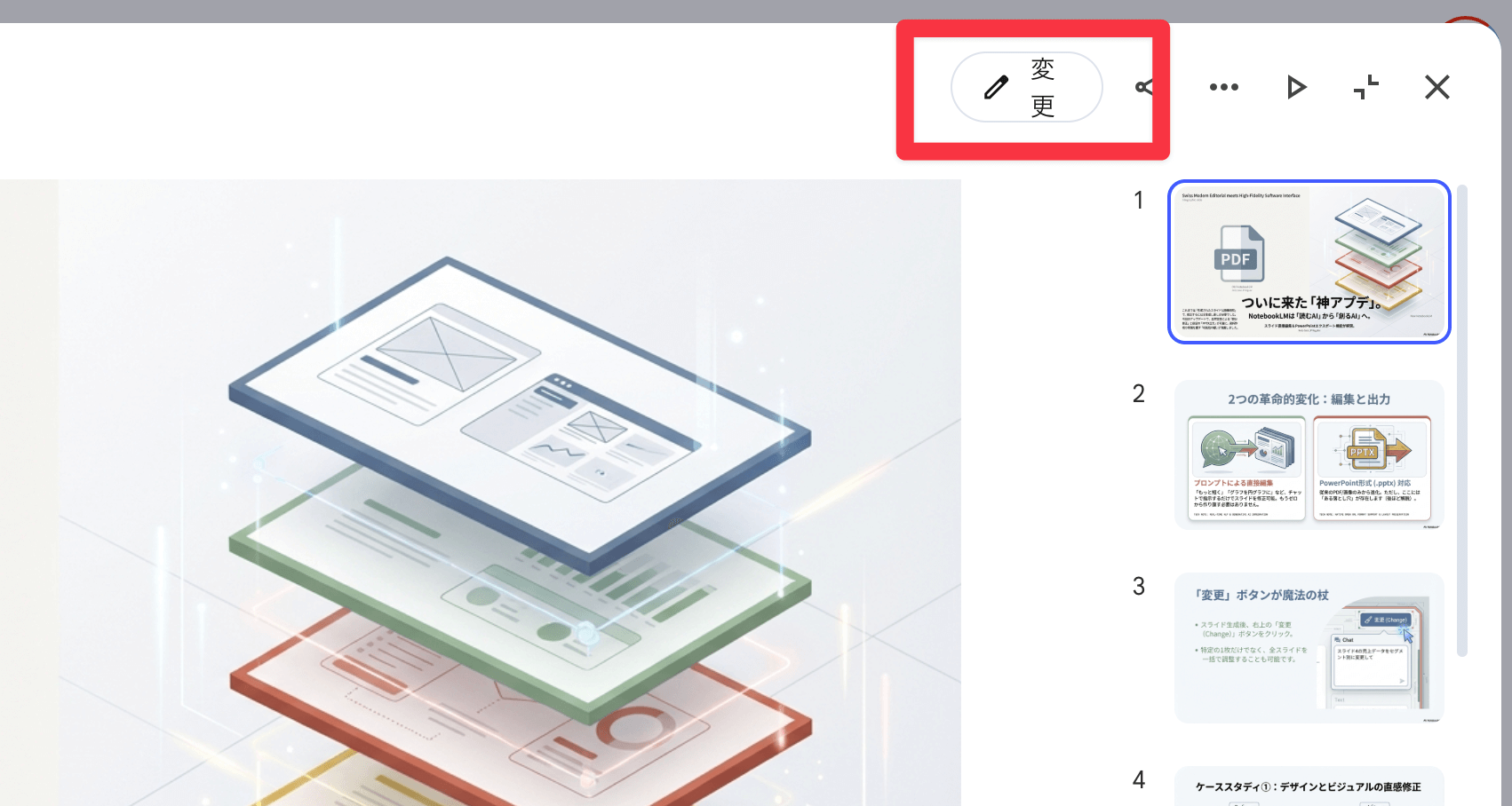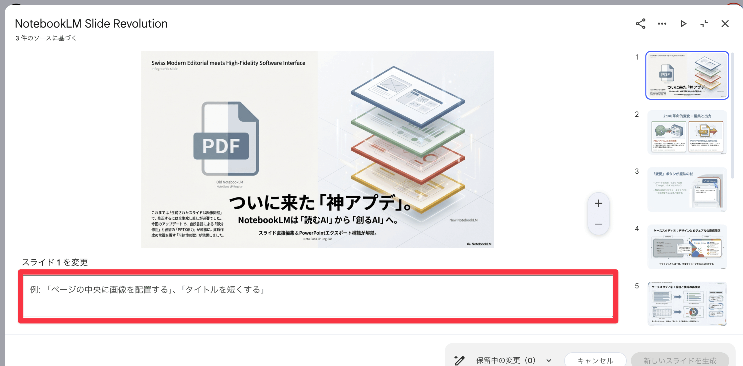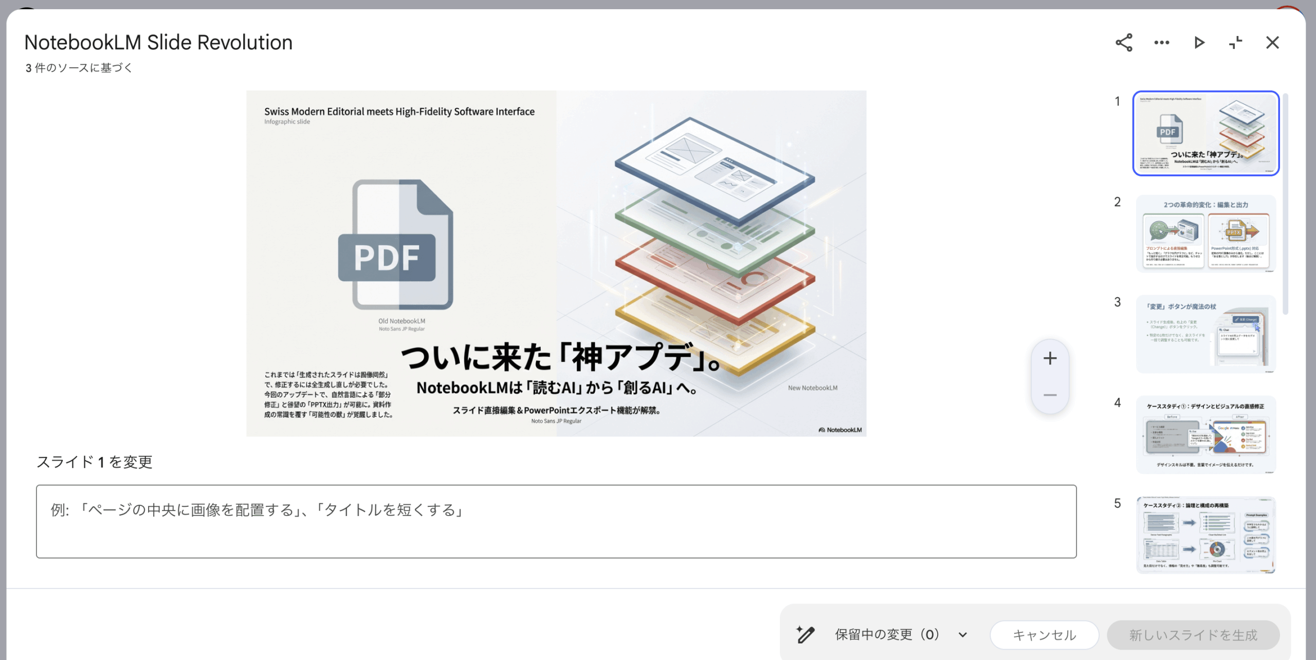 • 2026年2月のアップデートでNotebookLMのスライド修正機能が追加され、プロンプトで1枚ずつ編集可能に