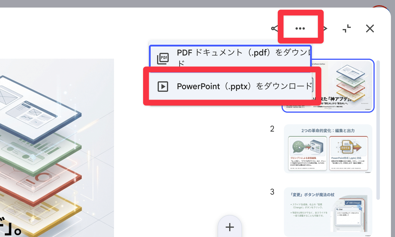 生成したスライドの右上にある3つのドットメニューをクリックします。
