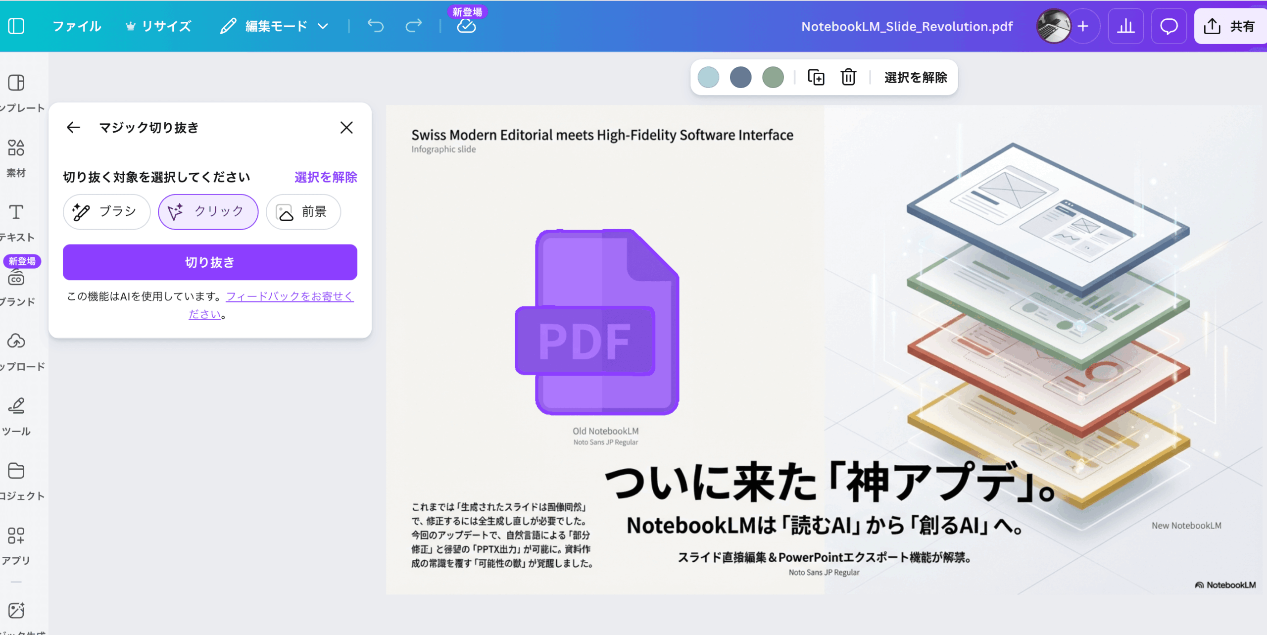 図形やイラストの編集が必要な場合は、Canvaの「マジック切り抜き」機能が便利です。