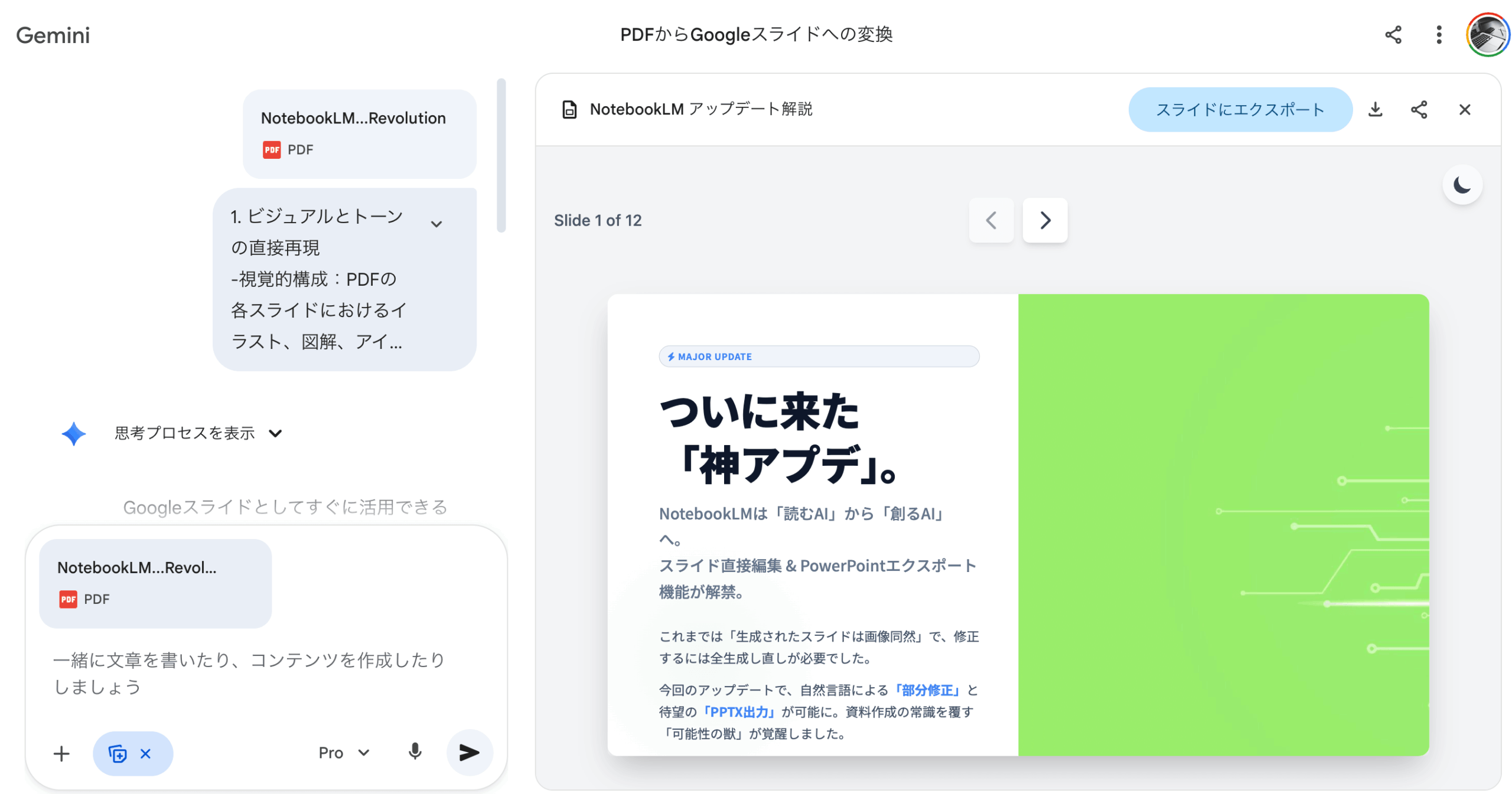 この制限については多くのユーザーから不満の声が上がっています。GoogleはGoogleスライド形式への直接エクスポートも近日対応予定とアナウンスしており、今後の改善が期待されます