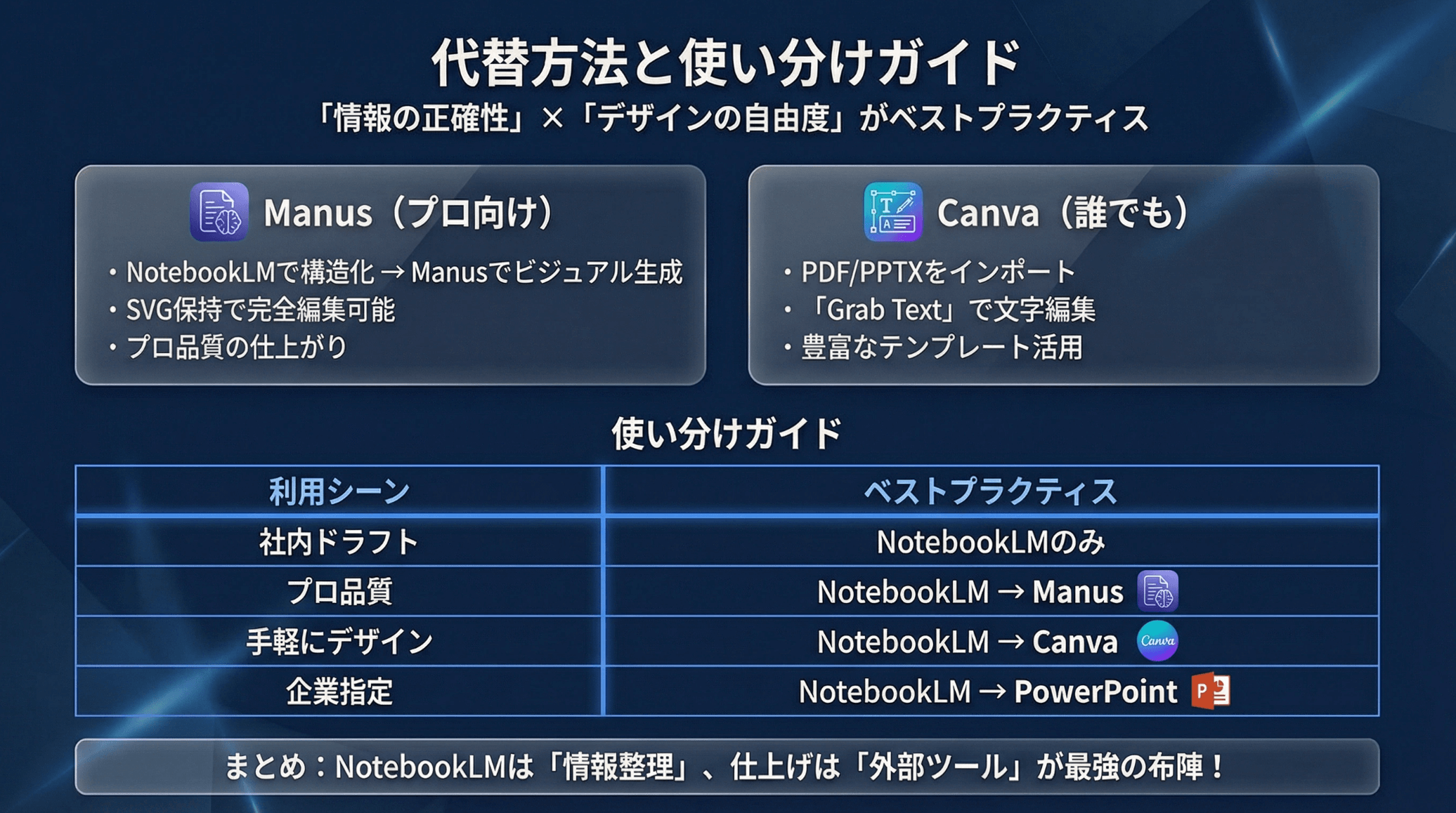 NotebookLMでベースの資料を作成 → テキストの微調整はプロンプト修正で対応 → 最終的にGeminiキャンバスで編集可能なGoogleスライドに変換。これが現時点で最も実用的なワークフローです。