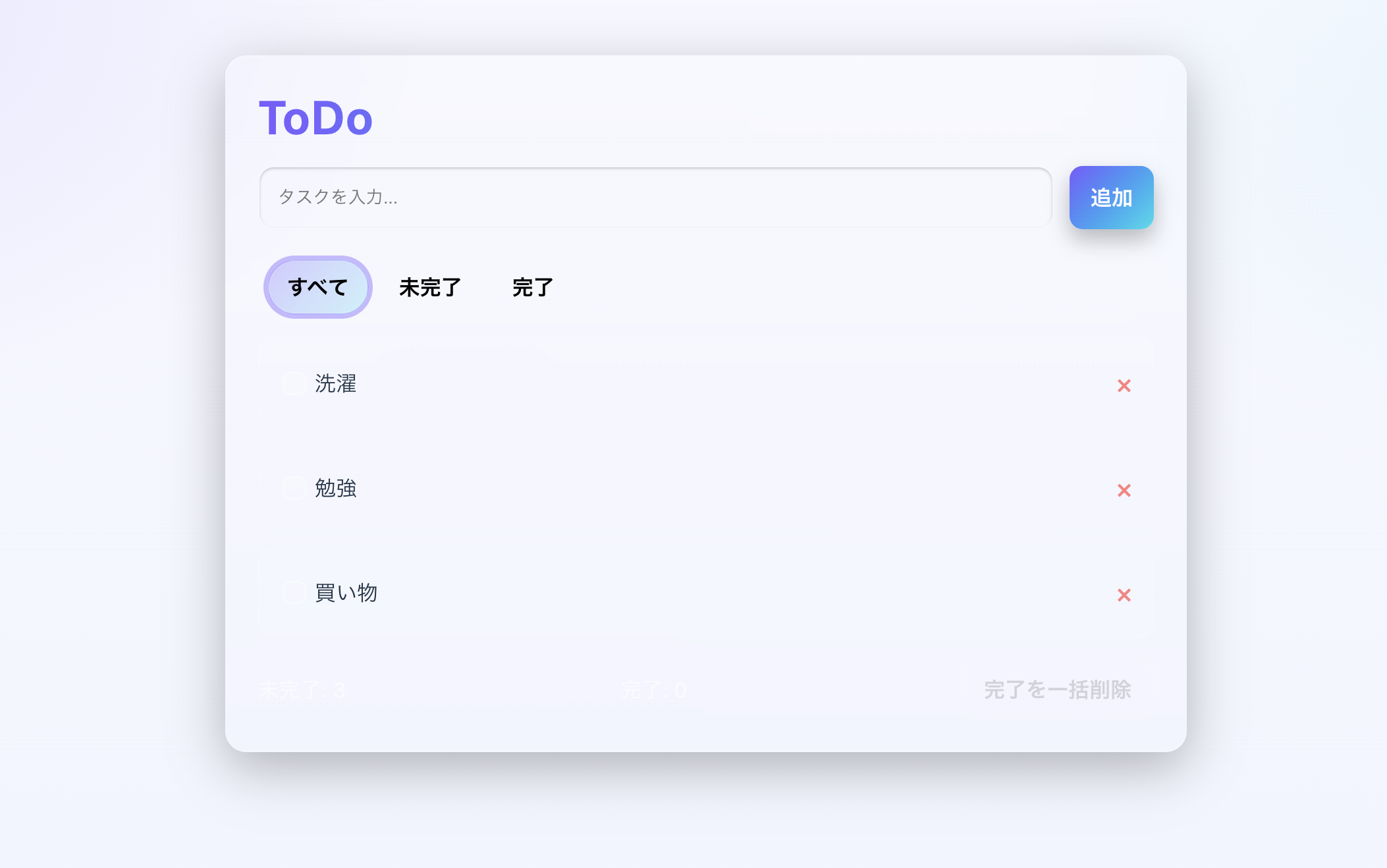 「ToDoリストのWebアプリを作って。React使用、ローカルストレージ対応、アニメーション付き」