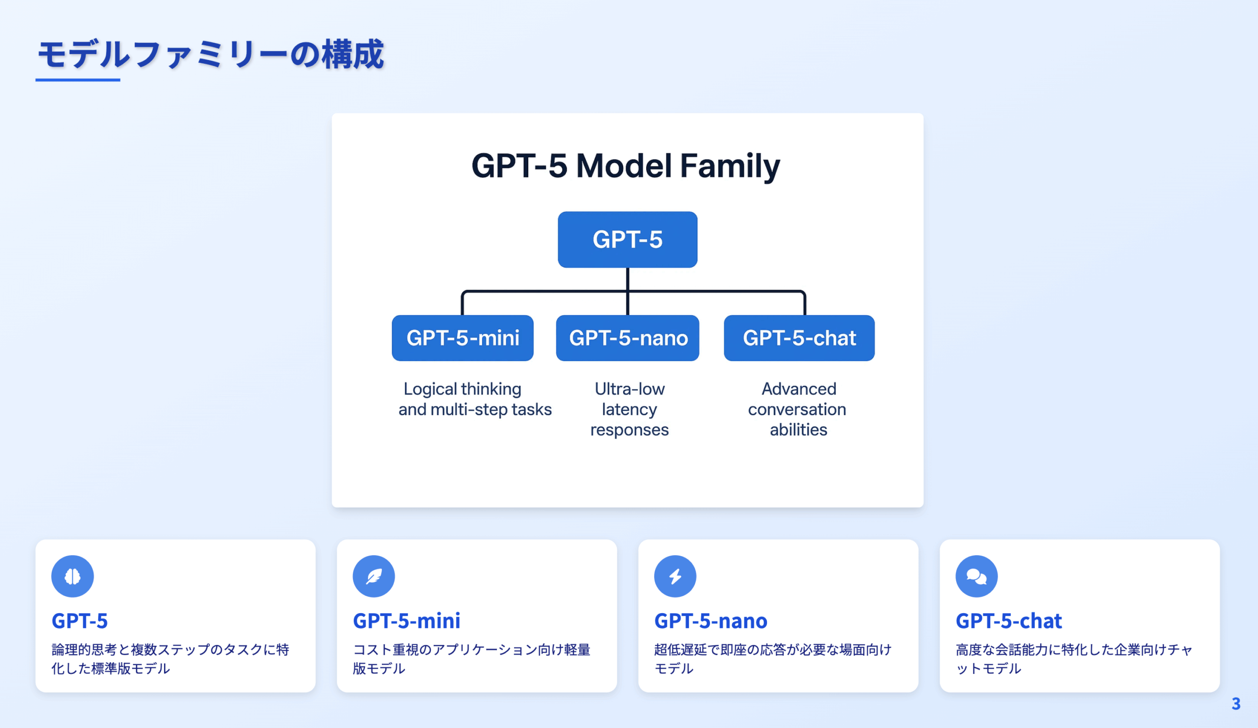 • 4つの専門モデル: 標準版、mini、nano、chatの使い分け
